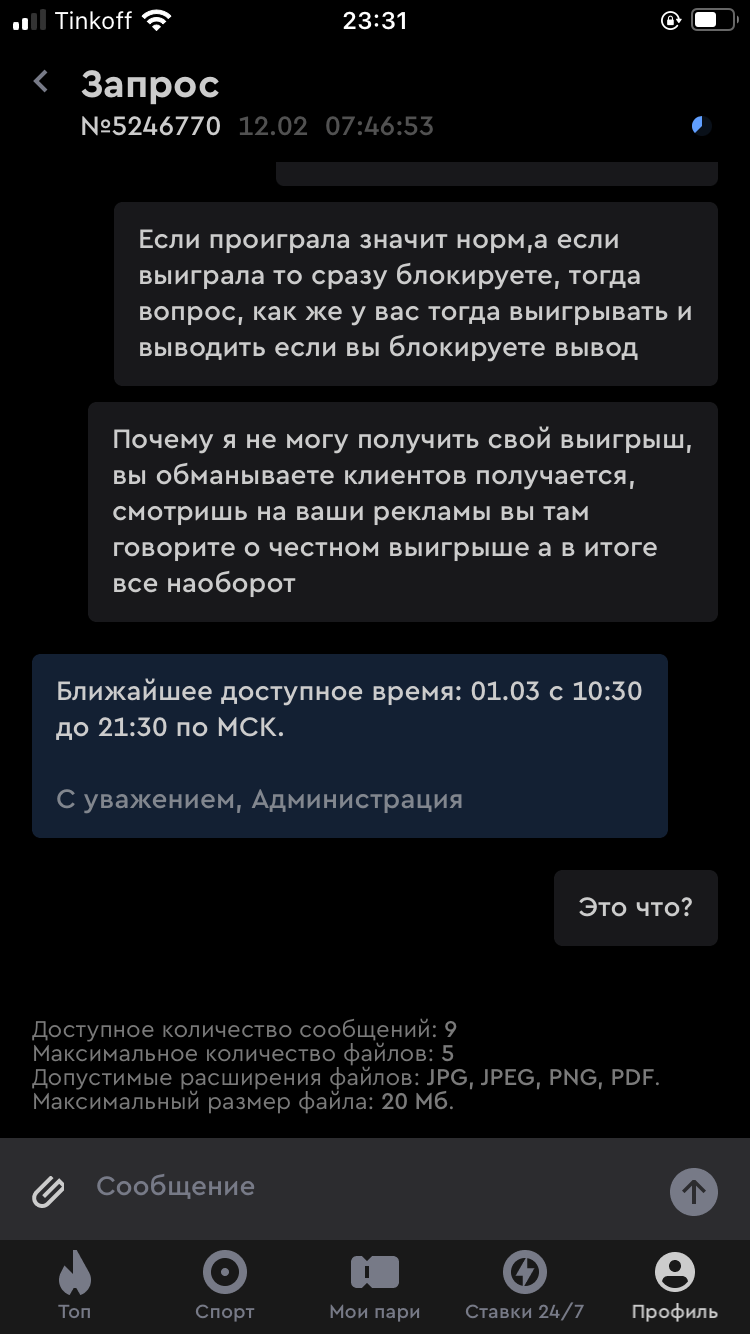 Я уже писала жалобу, не дают вывести честный выигрыш, прошла верификацию ждала 7 дней, потом сказали пройти видеоверификацию написали назначьте дату и время я назначила , они сказали видеоверификация с 27 числа, ссылаясь на правила пункт 3.4.1 хотя такого правила в с пунктом нет, это нарушение иных прав клиента,номер счета 21425269, разберитесь