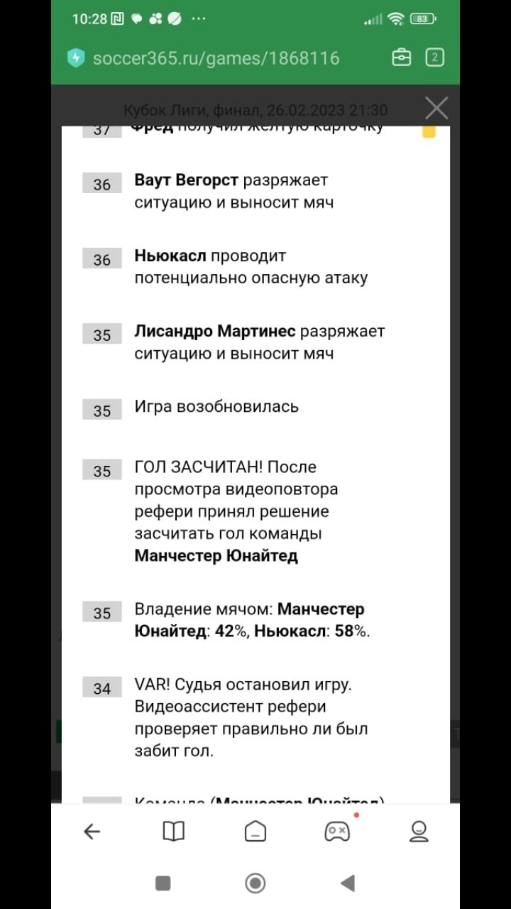 Здравствуйте как вы пишите что ставка рассчитана верно если во всех обзорах и сайтах видео просмотр был(war) после гола Каземиро судья засчитал гол после просмотра War в игре Манчестер Юнайтед -Ньюкасл, поставил 4529р на кэф 2,5 выйгрыш составляет 11233 прошу вас пересмотреть ваше решение ставка сыграла 100% ,если это событие было в матче как она может не сыграть верните выйгрыш иначе везде буду писать что у вас не добросовестная контора деньги на ставку принимаете ,а отдавать не хотите ладно бы если это событие не произошло в матче разговоров бы не было ,но war был поэтому ставка сыграла думал что у вас честная контора,а ещё представляете матч ТВ буду писать на канал верните ставку...