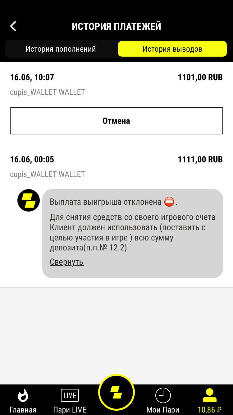 Отменили вывод, ссылаются на ложную информацию, я поставил свои деньги выиграл, и не могу забрать