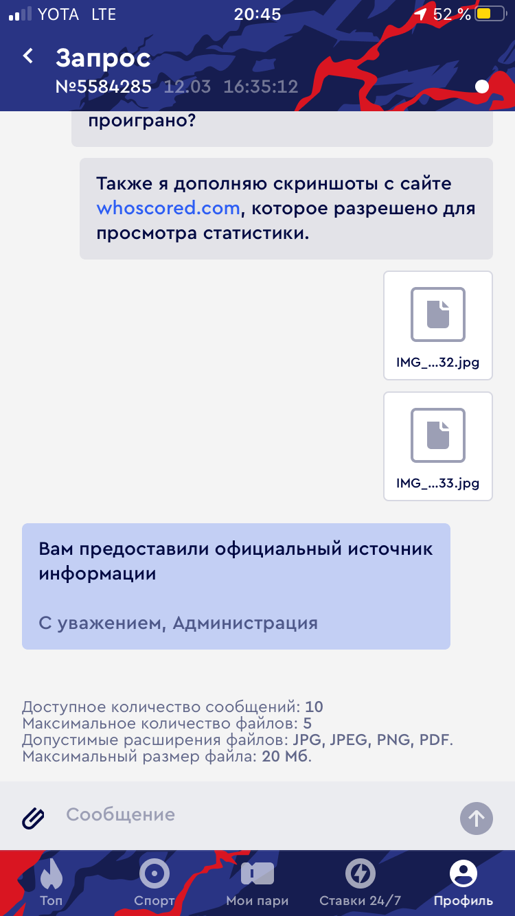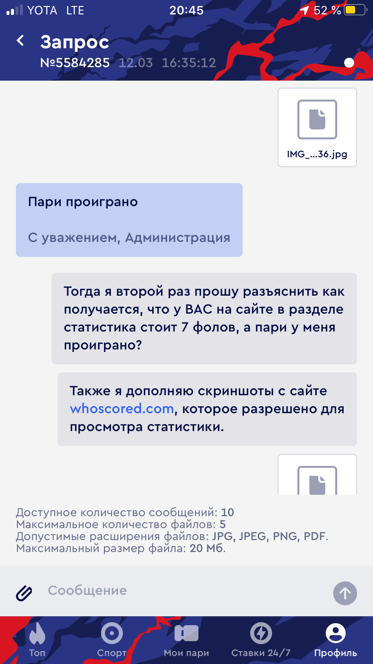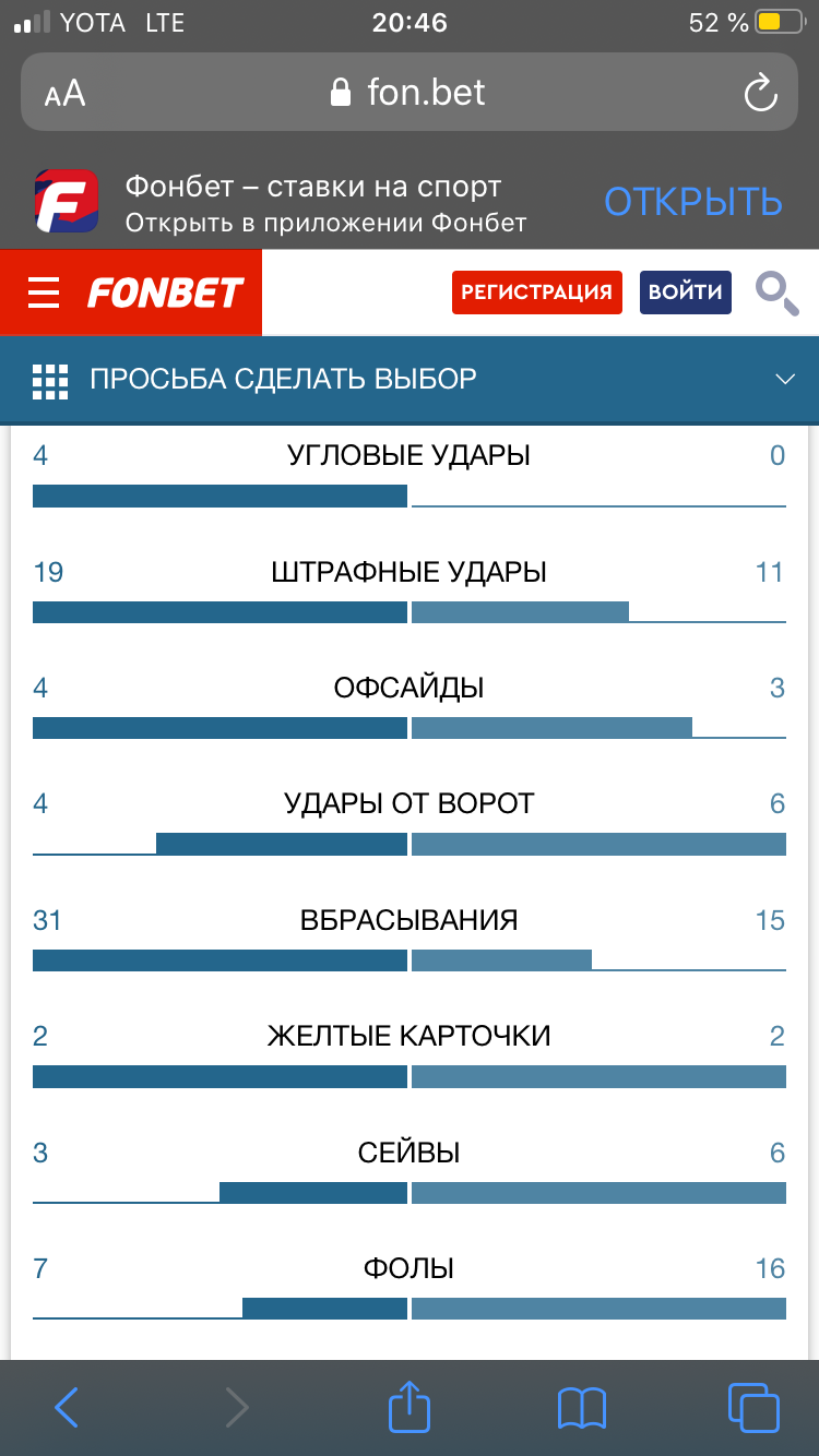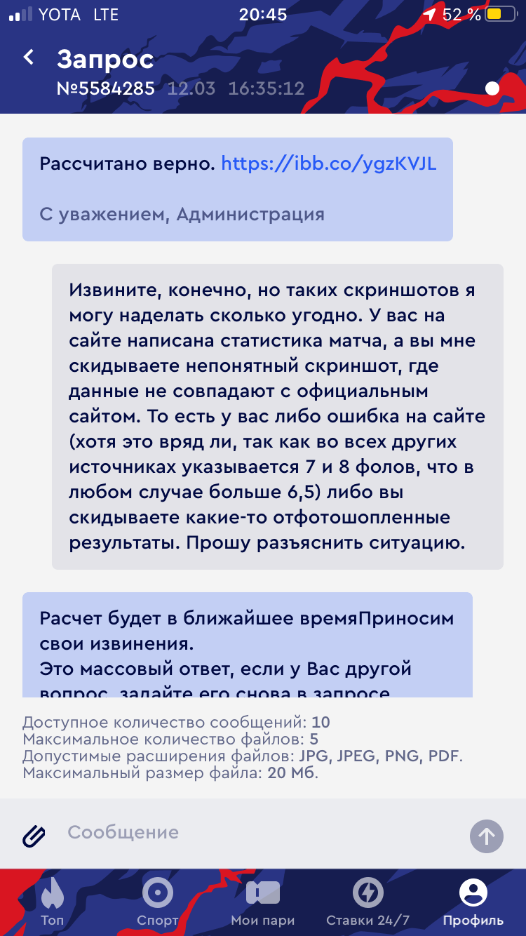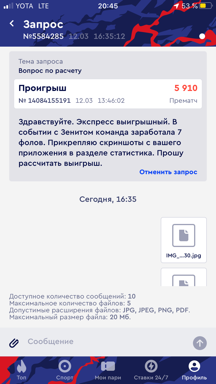 Заключал пари-экспресс, в котором было событие Зенит-Химки. Пари заключалось на индивидуальный тотал Зенита тб 6,5 фолов. По всем открытым источникам тотал фолов 7-8. Даже на официальном сайте и приложении БК Фонбет стоит 7 фолов. В поддержке ничем не помогли, отписываются заученными фразами. Ставил в этой БК с 2014 года и никогда похожих проблем не было. Но в этот раз что-то пошло не так.