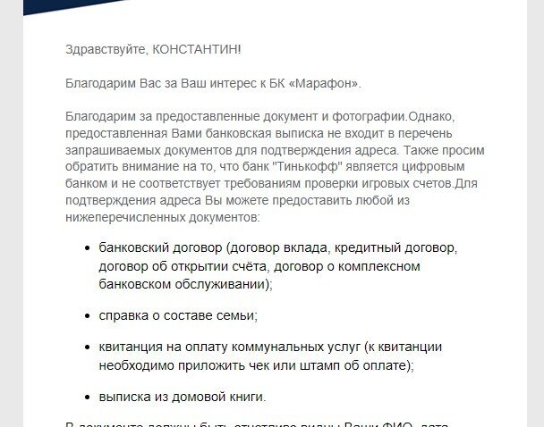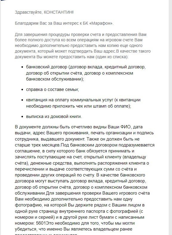 Здравствуйте. Попал на верификацию к марафону, запросили фотографии. Все фотографии отправил, а к подтверждению адреса добавил PDF файл, которая мне отправила поддержка Тиньков, где видно мой адрес и фамилию. Спустя пару дней мне пришел ответ, что подтверждение адреса не подходит. Всю переписку я сохранял, и вот что мне ответили "Некоторые документы принимаются в данном формате, но не этот. Вам необходимо получить банковскую выписку в бумажном формате (оригинал) и сфотографировать его, отправив в формате JPEG. Вам необходимо обратиться в службу поддержки данного банка и заказать бумажную версию данного документа. Тинькофф также предоставляет данный документ." Ну хорошо, звучит логично, конечно. Позвонил в Тиньков, попросил привезти выписку. В начале меня в банке не правильно поняли, и привезли не тот документ. Я сделал снова заявку, и вот спустя 3 недели ожидания все таки привезли нужный документ. Он соответствовал всем требованиям и критериям. Имел мою фамилию, был не позже трех месяцев, на нем видно было адрес и стояла печать банка. После того, как я загрузил этот документ, мне приходит письмо: " Здравствуйте, КОНСТАНТИН!Благодарим Вас за Ваш интерес к БК «Марафон».Благодарим за предоставленные документ и фотографии.Однако, предоставленная Вами банковская выписка не входит в перечень запрашиваемых документов для подтверждения адреса. Также просим обратить внимание на то, что банк "Тинькофф" является цифровым банком и не соответствует требованиям проверки игровых счетов.Для подтверждения адреса" Т.е. в их условиях абсолютно нигде не прописано что принимается, что нет. Документ, которйы соответствует я прислал, но в итоге пока эти документы шли, они придумали правило, что Тиньков не считается банком. Всем критериям соответствует документ. Сейчас они предлагают мне сделать тоже самое с другим банком. Я могу прождать еще целый месяц и снова не увидеть свои деньги, если по любому из их неопубликованных нигде критериев он не подойдет. Прошу разобраться, это полное мошенничество. На запрос поддержке перечислить мне полный список критериев, в котором будет написано, что Тиньков не считаетсся банком они присылаются обычную копипасту с перечнем нужных документов, под который идеально подходит мой. Все документы могу вам сюда загрузить, мне не сложно при необходимости. Могу предоставить все скриншоты с перепсикой и запросами.