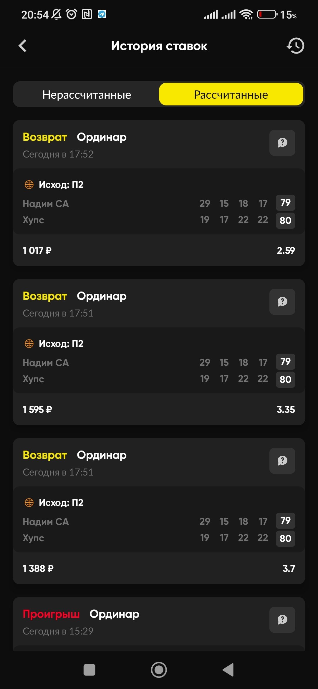 Прошу проверить, так как просто вернули 4000 р и не насчитали по трем ставкам в общей сложности на 4000 на п2 надим са и хупс . Скрин вложил. Ссылаются на то, что могут так делать. Ссылаются на пункт 2.8 и правила . хотя все было нормально, а когда выиграли п2, то насчитали просто с возвратом. Считаю, что это не честно как минимум и хотелось бы и деньги выигрышные вернуть.