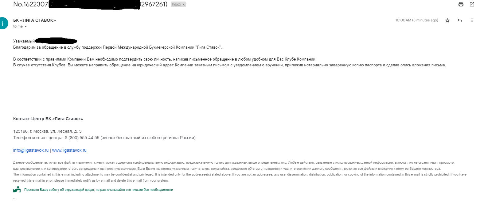 Здравствуйте,первый раз в жизни решил проверить как все устроено.При выборе бк увидел "Лига Ставок"-зарегистрировался,прошел всю индентификацию в онлайн режиме(лиги ставок нет в моем городе)подтвердил через ЦУПИС.Как говорится сделал все что нужно и можно.Внес депозит суммарно 2400р(повторюсь я первый раз в жизни подобным занимаюсь).Проставил на разные матчи,вышел в плюс и вывел ровно 1000,этим же днем проиграл 1500 ,добавил рублей 400 и в итоге получился счет равный 5000 рублей.Захотел вывести деньги,но система требует обратится на горячую линию.В чате поддержки сказано явится в один из офисов лиги ставок,но в моем городе их нет.Я регистрировал аккаунт в данной бк по причине наличия онлайн индентификации и посчитал эту компанию надежной.Когда обьяснил оператору невозможность поездки в другой город предложили написать на email лиги ставок и сообщить о моей невозможности поездки в офис для прохождения индентификации.....Причина ограничений не указана.Я искренне не понимаю о какой "полной" индентификации идет речь(сетчатки глаз и отпечатки пальцев им нужны помимо паспортных данных с цуписом и тинькофф id?) и считаю действия данной компании мошенническими.Одно хорошо что смешная сумма и теперь появился опыт связывания с подобными организациями.Все события длились с 19 по 21 марта 2023.Но я не могу даже представить себе гнев людей которые ставили в этой бк деньги серьезнее чем ставил я.