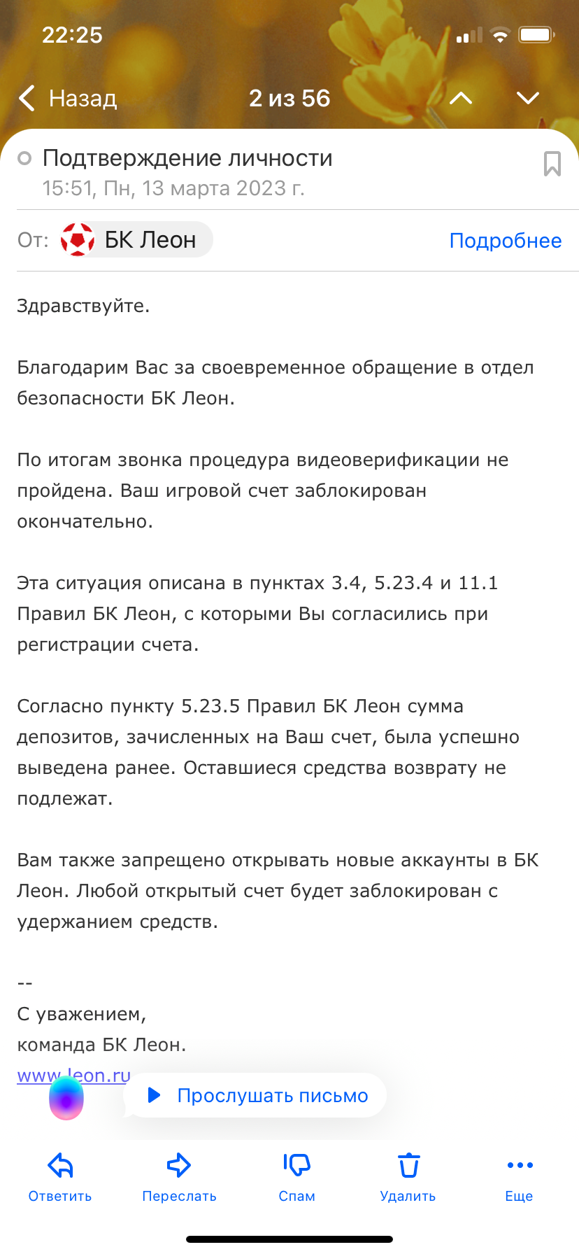 Здравствуйте, зарегистрировалась на Leon в конце января 2023г. Использовала только мобильное приложение со своего телефона, с пополнением депозита и выводом средств проблем не было. Через месяц попросили дополнительную идентификацию личности - документы отправила , сначала счет открыли , а позже заблокировали до проверки . Примерно через 3 недели пошла видео верификацию , вопросы были: по лайф ставкам , кто ставил с моего акаунта , общие термины по сайту и т.д. Ставила сама , где-то смотрела аналитиков , где-то советовалась с мужем. В том числе ставила в лайфе после голов на противоположны исход. Зарегистрирована в другой БК - никаких проблем не было со ставками такого рода. От идентификации личности не уклонялась , видео конференции тоже, ставки ставила несложные , понятные мне. После видео конференции счет заблокировали окончательно. Все ставки поставленные мной были понятны и прозрачны . Прошу разобраться в данной ситуации. Скриншот о причине блокировки прилагаю, сумма заблокированных средств порядка 20000₽ .