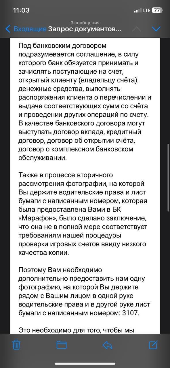 6 марта получил от БК Марафон письмо о предоставлении документов. Предоставил им 2 документа на выбор. Прописку подтвердил договором на банк обслуживание с банком Тинькофф. Попросили перефоткать селфи с водит правами и предоставить другой документ, подтверждающий прописку. 7 марта сходил в Сбербанк , запросил договор на банк обслуживание . Сразу же все отправил. Марафон уже более 3 недель рассматривает документы, в чате ответили что получили их….первые документы смотрели в течение нескольких часов, оперативно отвечали что им еще надо от меня, а тут молчат….скрины прилагаю.