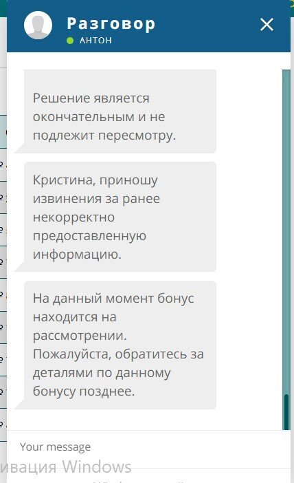 Здравствуйте. Без причины отобрали бонус, ко всему прочему поддержка выдумывают критерии на ходу, путаясь в информации по аккаунту, оправдывается лишь бы не начислять деньги. Я уверена, что произошла ошибка, так как вначале они думали, что бонус надо аннулировать ,потому что средства выводили, потом написали что на основании проверки транзакций и првоерки на стратегии. Пополнялась контора только с кошелька ЦУПИС, а все ставки почти проиграли, и итоговый минус более 30к. Что за стратегия такая проиграть 30к, чтобы выиграть 4к) В общем, думаю, произошла ошибка, поддержка говорит, что решение обжалованию не подлежит, но возможно у вас есть рычаги для пересмотра ситуации в мою сторону. Все условия были честно выполнены