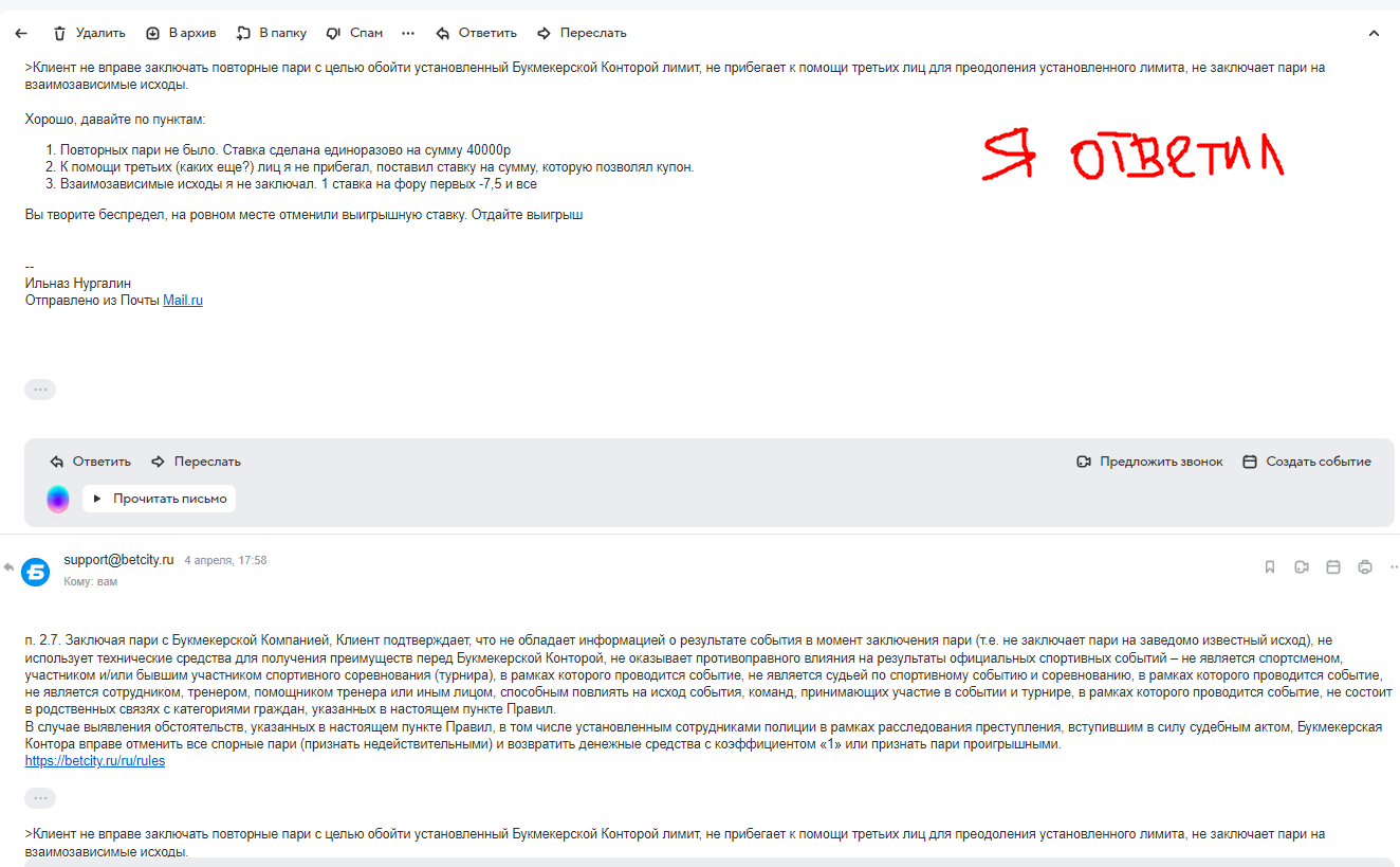 Здравствуйте, я сделал ставку на баскетбол на матч Сакраменто Кингз - Юта Джаз. Ставку сделал за 7 часов до начала события по линии, поставил -7,5 фору на первых. По завершению матча, ставку рассчитали выигрышем, но заблокировали кабинет при попытке вывести средства. Я отправил все документы для разблокировки и после входа в аккаунт увидел, что ставка рассчитана "отменой". На мой вопрос, почему так и в чем дело - мне вменяют пункты правил, никаким образом не касающимся меня (ниже скришнот прикреплю, что мне ответили на почте). В итоге имею картину - поставил, выиграл, выигрыш забрали по выдуманному предлогу. Помогите, пожалуйста, вернуть выигрыш