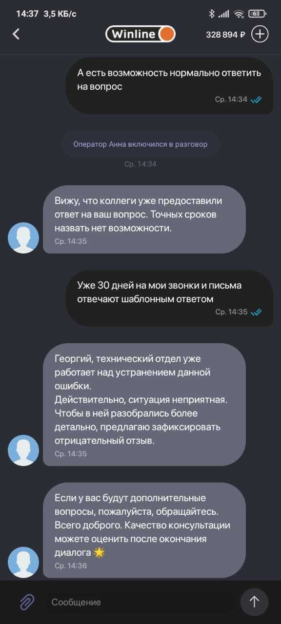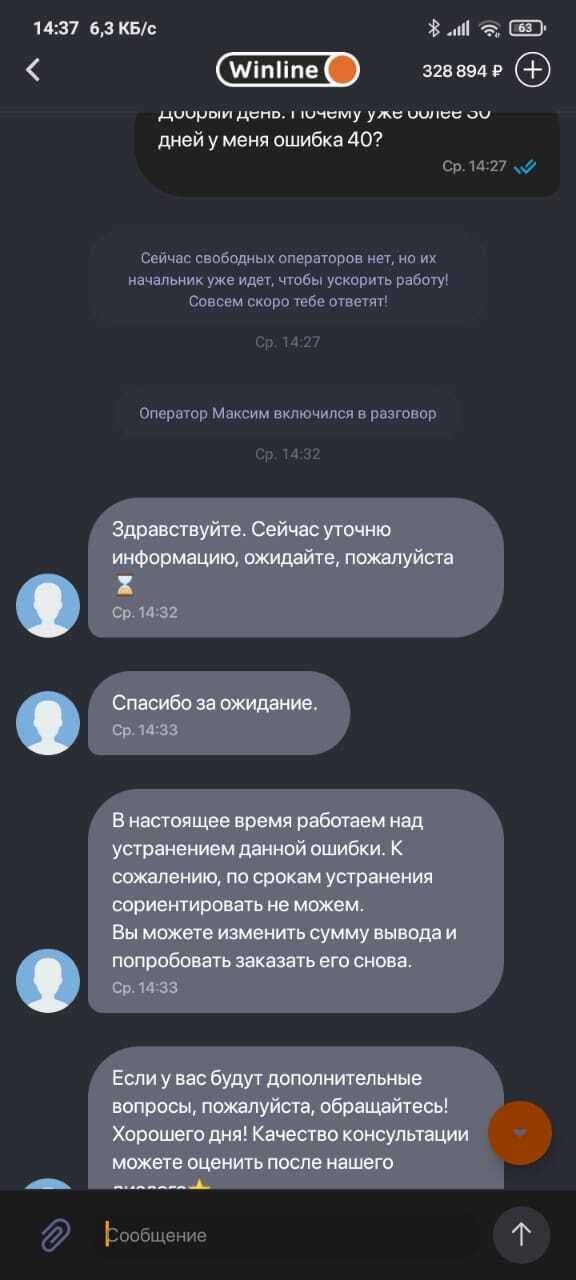 Здравствуйте! Прошу разобраться в данной ситуации. Прошел все виды проверок , от видео до запросов документов. Идентифицирован с ног до головы. Вывел 1 раз 14 к рублей и после этого стали выскакивать ошибки,как только я пытаюсь поставить сумму на вывод. Я наслышан о такой "проблеме" у других клиентов Винлайна. Это проблема только у тех кто что-то выиграл. Считаю,что делать искусственные ошибки в системе не совсем честно. Много раз звонил в службу поддержки клиентов и писал в чат.Проблему не устраняют. Если здесь есть представитель Винлайн , то прошу разобраться в этой ошибке и помочь мне вывести мой выигрыш. Прошу посодействовать в этом вопросе. В общем и целом БК Винлайном доволен,большие кефы,хорошие лимиты, но как только хочешь вывести - сразу "ошибка".