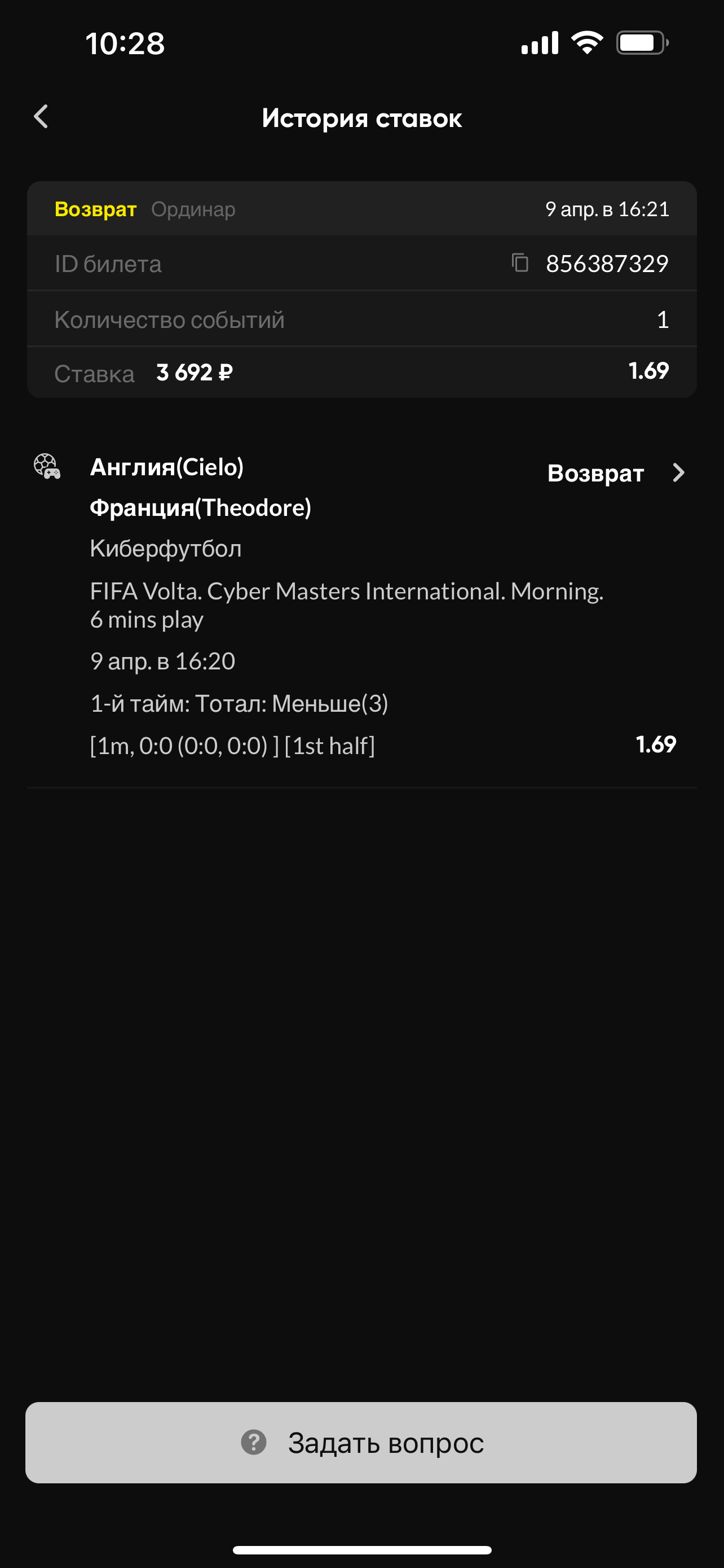 Ставила на матч киберфутбола.смотрю всегда видео со своей ставкой. Ставила на 1 тайм меньше 3 ,сыграли 1-1.и вуаля потом оказалось когда они сыграли уже отменил букмекер матч .👍 по крайней мере не красиво.