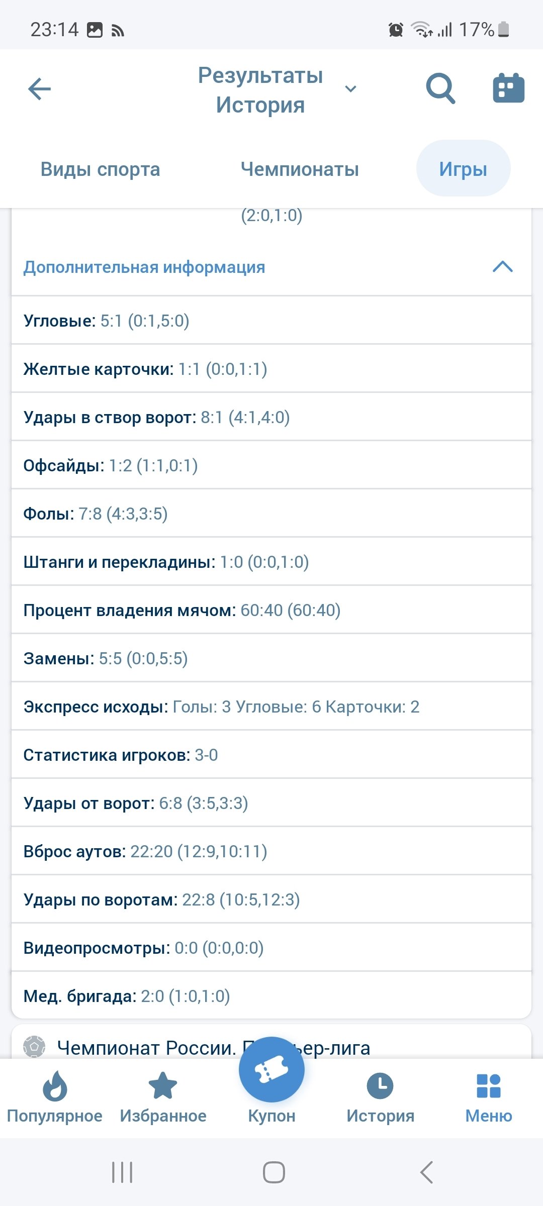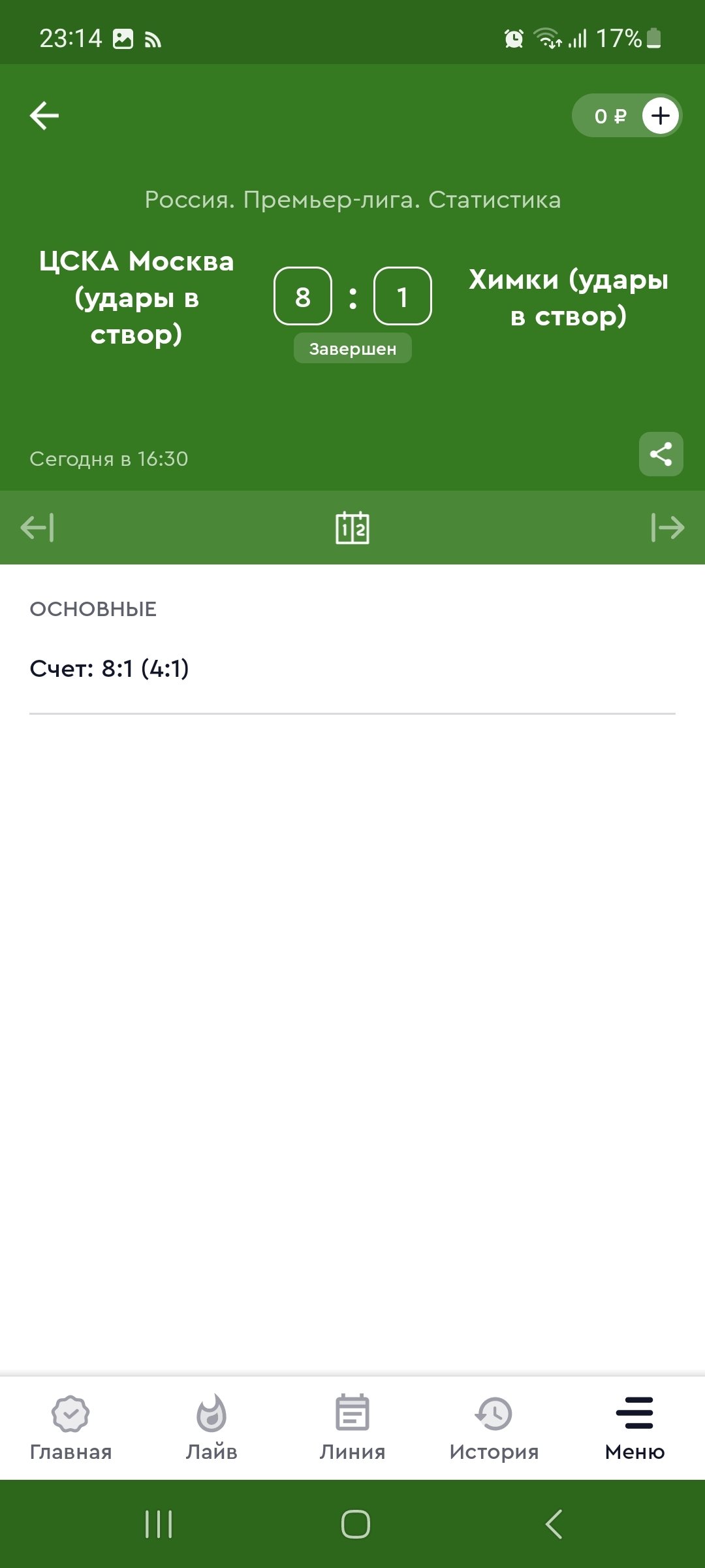 Брал удары в створ Цска -химки, смотрел сам матч было 5 ударов в створ ,у меня стояло тотал 4,5 больше в 1 тайме, на всех официальных сайт также 5 ударов,и на букмекерских конторах тоже 5,ну почему то у них рассчитали как минус