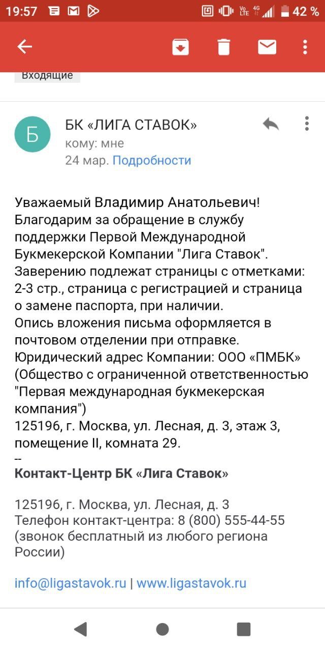 Я зарегистрировался в и размещал ставки согласно условиям и положениям букмекерской конторы. Логин: +7921 020 44 21. Мною было совершено 8 депозитов на общую сумму в 86000 рублей. После чего был совершен вывод на сумму в 5000рублей. Однако большая часть выигрыша оставалась еще на счете. Далее последовала блокировка вывода средств в размере 99000 без объяснения причины. Через несколько дней при попытке авторизоваться на сайте под своими учетными данными я увидел уведомление о том, что мой аккаунт заблокирован. Обратившись на почту мне сообщили что надо отправить нотариально заверенные документы в ООО “ПМБК”, т. к. в моем городе нет пункта приема ставок. После получения отправленных мной, нотариально заверенных документов, все ставки были рассчитаны возвратом и аккаунт заблокирован. Я убежден что не нарушал условия и положения. Прошу помочь разблокировать аккаунт и вернуть мои денежные средства. Прилагаю скриншоты о ставках рассчитанных возвратом, запрос на почту о предоставлении нотариально заверенных документах, скриншот о том что букмекер принял обращение в работу.