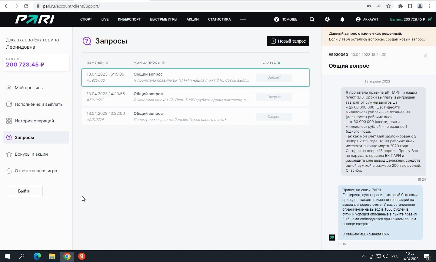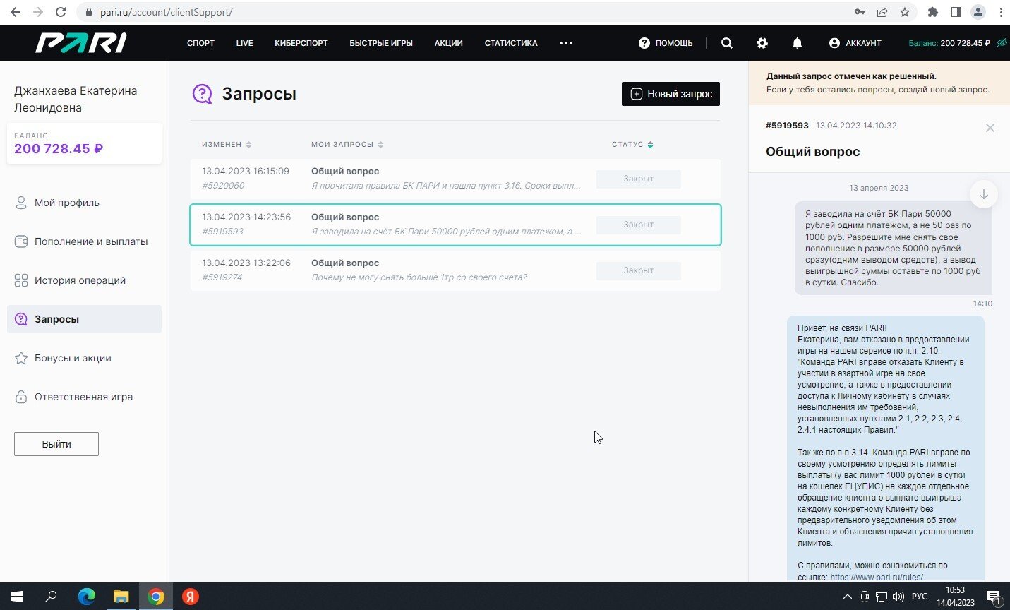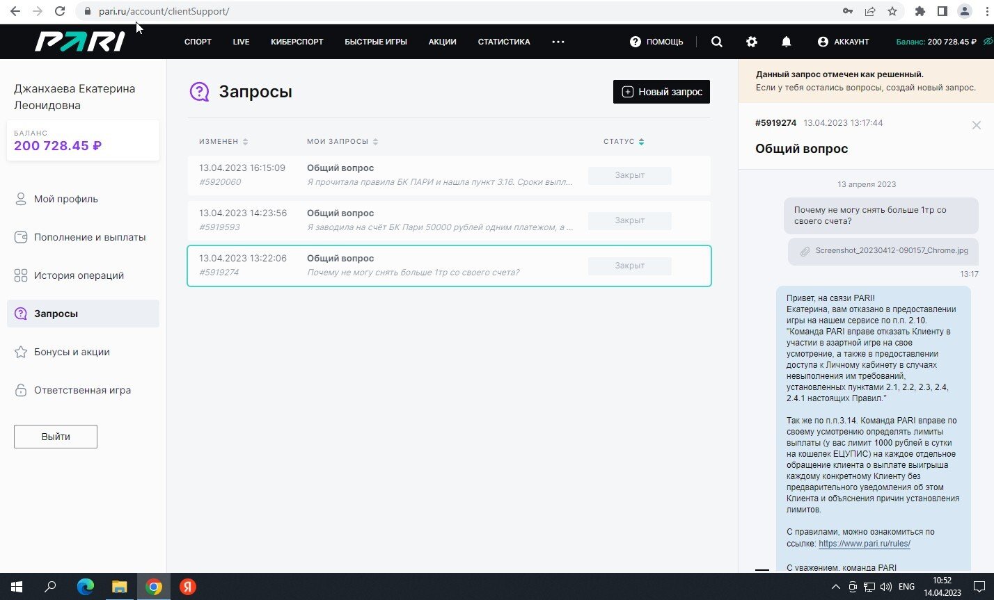 1 ноября 2022г я зарегистрировалась в БК ПАРи и пополнила свой счет № 17020616 на 50000 рублей одним платежом. Ставила ставки от 15000 руб. и более. Уже 2 ноября мой счет заблокировали и попросили прислать пакет документов (фото паспорта, фото банковской карты и др). Я их прислала. Далее поговорили с сотрудником БК ПАРи по скайпу. Потом по требованию БК ПАРи приехала в Москву в единственный ППС - пункт приема ставок. Хотя, по моему, никакой это не ППС, так как ставку сделать там нельзя и работает это заведение только в четверг и только ДВА часа, с 16 по 18 часов. 10 апреля 2023 года мне разрешили вывод денег , но по 1000 рублей в сутки основываясь на пункт правила БК Пари которое звучит : Администрация Букмекерской конторы вправе по своему усмотрению определять лимиты выплаты (минимальный и максимальный) на каждое отдельное обращение Клиента о выплате выигрыша каждому конкретному Клиенту без предварительного уведомления об этом Клиента и объяснения причин установления лимитов. Тогда, почитав правила БК Пари. Я обнаружила пункт , который звучит: Сроки выплаты выигрышей зависят от суммы выигрыша : – до 60 000 000 (шестидесяти миллионов) рублей – не позднее 90 (девяноста) рабочих дней; – от 60 000 000 (шестидесяти миллионов) рублей – не позднее 1 (одного) года. Получается БК Пари ограничивая мне максимальный лимит выплаты суммой 1000 рублей в сутки НАРУШАЕТ свои же правила, а именно пункт . так как сумма на моем счете меньше 60 000 000 рублей и с момента блокировки счета (г.) прошло более 90 рабочих дней. Прошу Вас разобраться в моей ситуации. Запросы в БК ПАРи и их ответы прикрепляю.