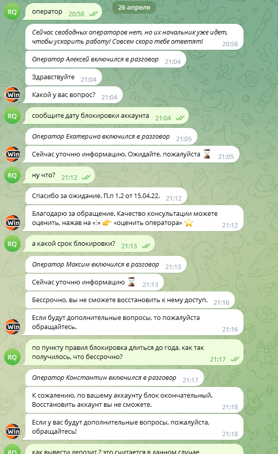 Здравствуйте! Играл в винлайне год назад, накопилась сумма на счету более 50 тыс руб. Решил ее вывести, естественно запросили видеовериф и документы. Все необходимое отправил и прошел. Спустя время прилетает блок, до года за какие то якобы нарушения. Решил почитать что про это пишут, и понял что придется ждать год и смысла писать раньше нет. И вот недавно вспомнив, решил вчера попробовать зайти на акк , выдает то что лк заблочен. Думал поддержка поможет в данном вопросе, в итоге поддержка (СПУСТЯ ГОД БЛОКИРОВКИ!!!) сказала , что никакие деньги мне выплачивать не будут, даже не сказав причину, просто захотели видимо... В общем прикреплю диалог с их поддержкой и прошу вашей помощи!