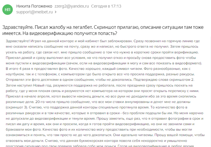 Здравствуйте! Играл на данной конторе и мой кабинет был заблокирован. Сразу позвонил на горячую линию где мне сказали написать сообщение на почту, сразу же и написал, но быстрого ответа не получил. Затем пришлось уехать на работу, где связи нет. мне пришло сообщение о том что нужно в короткие сроки пройти верификацию. Приехал домой и сразу выполнил все условия, на что получил отказ и просьбу снова предоставить фото чтобы меня пустили к видеоверификации (зачем, если на видеоверификации я могу и сам все показать в видеоформате). В итоге 4 раза я предоставлял фото. Качество хорошее, каждый символ читаем. Фото разнообразные, как с ноутбуком, так и с телефоном, с компьютером где было открыто все что просила поддержка, разные ракурсы. Отправлял эти фото десятками в одном сообщении, чтобы не докопались. Подтверждаю слова скриншотом 2. Затем наступил Новый год, разумеется поддержка не работала, после праздника сразу пришлось поехать на работу, где у меня плохая связь и разумеется нет компьютера на котором они просят открыть переписку с ними. Приехал в начале апреля, хотел вывести наконец деньги, но все руки не доходили ибо за это время скопились различные дела. 20-го числа пришло сообщение, что все мои ставки аннулированы и денег мне не должны (скриншот 3). Считаю, что поддержка данной конторы специально протянула время. То количество фото в различных ракурсах и в том качестве, которые я отправил в сроки - без проблем подошли бы им. Но меня нарочно не допускали до видеоверификации и тянули время. Прошу заметить, еще раз, что я отправил фотографии в срок и писал им дату и время, как они и просили, когда я готов пройти видеоверификацию, но они не звонили сами и браковали мои фото. Качество фото и их количество могу предоставить при необходимости, чтобы вы могли ознакомиться и понять, что там просто не до чего докопаться. Они идеально читаемы. Прошу вашей помощи, чтобы отвоевать мои деньги. Считаю, что данная букмекерская контора повела себя некорректно и умышленно подстроив ситуацию под свои правила забрала себе мои деньги. Готов на видеоверификацию в любое время