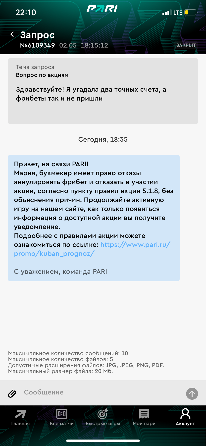 Здравствуйте! Не в первый раз я сталкиваюсь с проблемами этой конторы. Где то месяц назад я выиграла 20тыс. руб и меня мутозили две недели с верификацией, ну ладно тут все обошлось и еле-еле вывела средства, но после данного выигрыша мне по всей видимости заблокировали все акционные предложения. У Пари есть акция по угадыванию точного счета футбольных партнеров. Я угадала 2 т/с (1т/с=1тыс.фрибетов). Сегодня сделала запрос почему так долго начисляют бонус и получила отказ в начисления фрибета по пункту правил 5.1.8 (аннулировать фрибет без объяснения причин). Это как получается, значит я выиграла какие то 20тыс и на меня контора обиделась, и решила отказать в предоставлении бонуса (не предупредив, что есть возможно какой то теперь запрет на фрибеты). Прошу разобраться, почему такое вообще возможно. Сначала пожалуйста участвуйте в акции, но угадав т/с мы аннулируем ваш фрибет. Смысл тогда проводить акции??