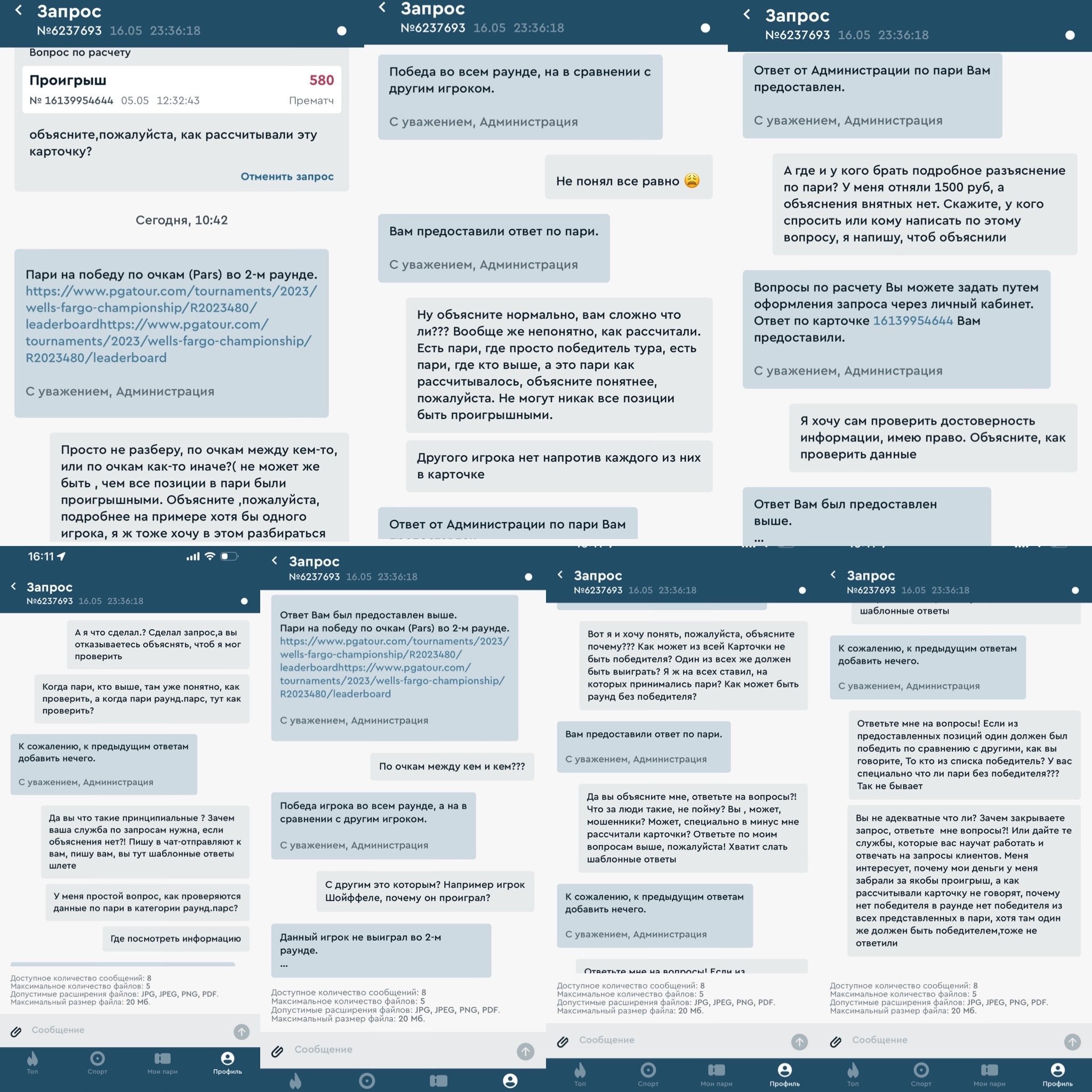 Сегодня написал очередной запрос на разъяснений расчетов по моей ставке, говорю, мол, я сделал ставку на гольф, 2раунд, парс, сколько было позиций представлено в этой категории , я выбрал все и поставил на все, ставка выглядит так(скрин в приложении), говорю, почему по итогу все проигравшие, получается, что в ставке в априори что ли все в проигрыше, на что мне просто шлют шаблонные ответы, типа , вам предоставили ответ по пари и добавить, к сожалению (ага, сожалеют они) нечего! Я уже в истерите от этого безобразия присел с таким разочарованием, что нынче так нагло забирают у людей деньги, а разъяснений нет! А знаете, почему нет? Потому что все , кто на запросах и в чате Фонбет до безобразия некомпетентны!!! Дают ответы нелогичные, когда ставишь конкретный вопрос, просто шаблонный ответ шлют. Они представления не имеют , как рассчитывать гольф, они намеренно людей шаблонными ответами игнорят и доводят до истерики! Когда уже их всех проверят и наладят старый добрый Фонбет, непонятно! Прошу, разберитесь ! Воосиановите, пожалуйста, честный и справедливый порядок. Чужого мне не надо, но и свое не хочу так просто отдавать. Я не родственник Абрамовича, чтоб деньгами так пренебрегать Таких 2 ставки. Одна представлена ниже, а другая #16139949551 на сумму 1000 руб