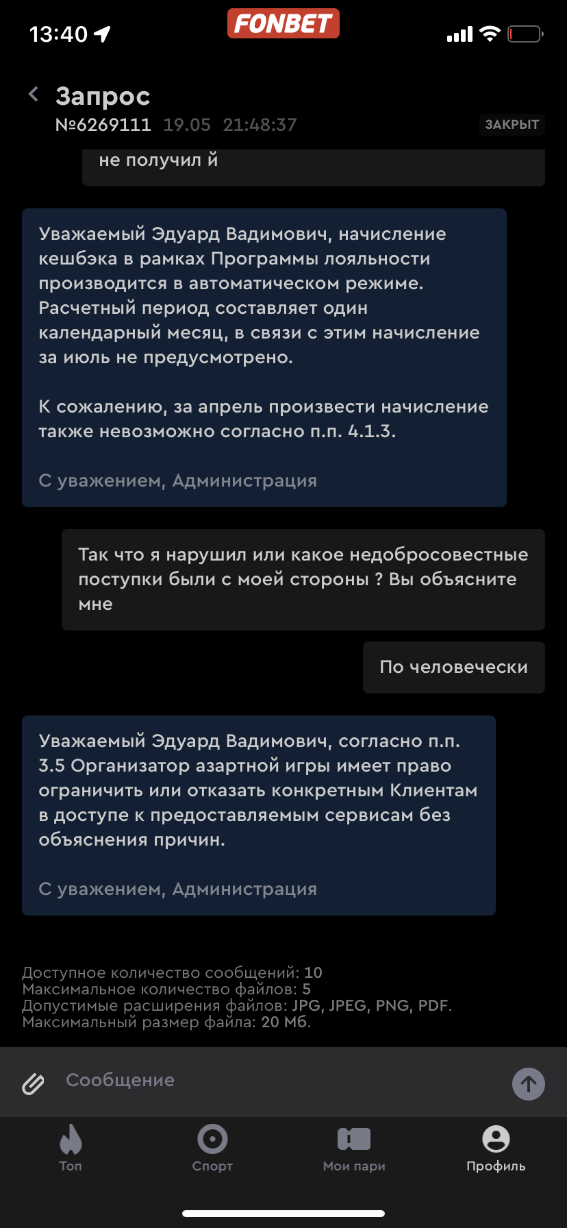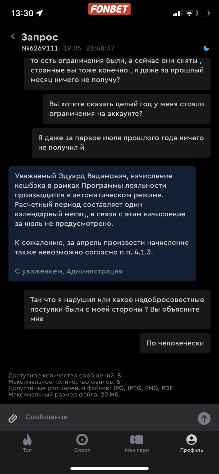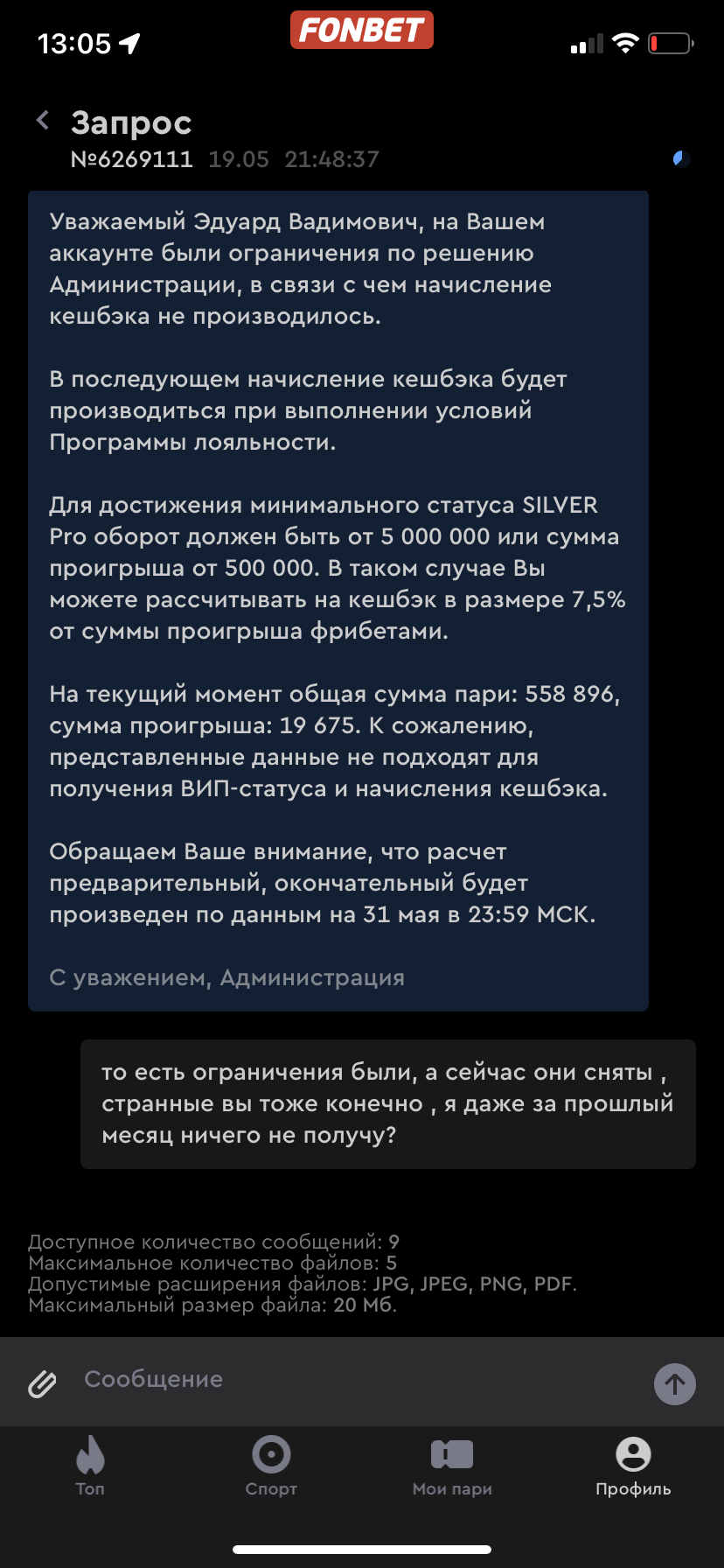 У меня накопился кэшбэк с в программе лояльности, зашёл только вчера и увидел это. Написал в поддержку почему я не получил эти деньги , на горячей линии, люди удивились и сами отправили запрос. В запросе поступил такой ответ, что у вас были ограничения,по скольку с вашей стороны были, недобросовестные действия , хотя я на протяжении 6 лет уже ставлю , являюсь их вип клиентом, и они так поступают. Самое смешное , они говорят, что у меня были ограничения , почему начисления были, а фактического перевода нет, на что горячая линия просто сбрасывала трубку и Тычила связаться с администрацией. И говорят что с этого месяца ограничения все сняты , вам нужно проставить ещё на 4 миллиона 500 тысяч рублей, смешные такие. 1. Не уведомляли меня об ограничениях. 2. Сняли ограничения,о которых я даже не знал, с этого месяца и говорят можете проставить 4 миллиона 500 тысяч , что бы получить кэшбэк. 3. Были начисления за последние 5 месяцев , а фактического перевода денежных средств не было. 4.Но если бы были бы у меня какие то ограничения по этой программе, то и самих бы начислений бы не происходило, хотя по правилам самой акции денежные средства должны были поступать 1 числа нового месяца с 12:00 до 18:00.