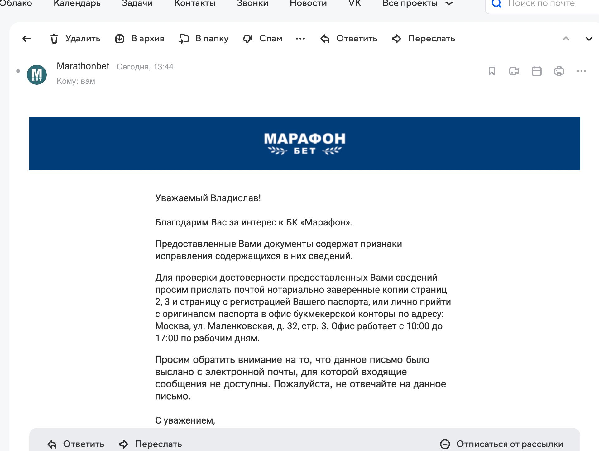 По информации от букмекера, у пользователя запрошены нотариально заверенные копии документов по причине предоставления фотографий документов с признаками вмешательства. При этом владелец аккаунта идентифицирован согласно законодательству РФ. Учитывая обоснованность жалобы игрока (требования к верификации явно завышены) и аргументы, предоставленные букмекером, Арбитраж Легалбет в данной ситуации не может признать правоту какой-либо из сторон. Решение этого вопроса за пределами компетенции Арбитража.