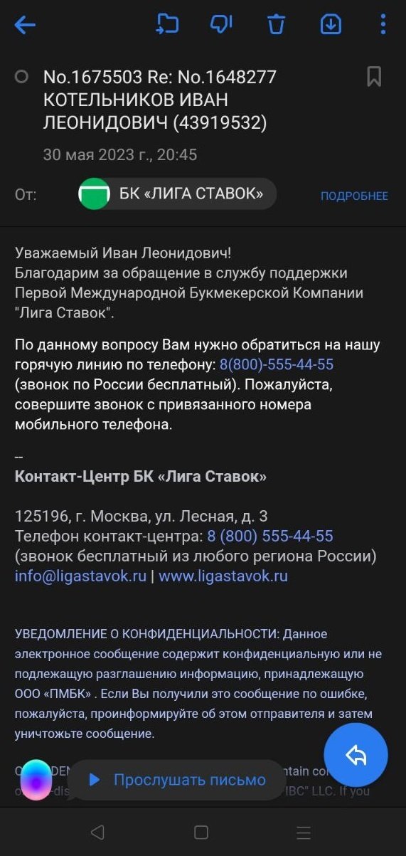 Здравствуйте, помогите мне пожалуйста. Рассказываю как все было. Активно ставил на лиге ставок по-немногу, все было хорошо. И приходит мне от них как-то смс с акцией. Нужно было пополнить счет и проставить эти деньги и тебе дадут половины от этой суммы фрибетом. Я так и сделал. Пополнил на 200000 рублей, поставил ставку, потом вывел. Мне дали честно заслуженый фрибет и я решил его поставить на коэффициент повыше, попытать удачу так сказать. Я поставил на ничью в матче Галатасарай - Фатих. Это турецкая суперлига по футболу. Высший дивизион. И чудо свершилось, моя ставка выйграла, я очень был рад этому. Я скорее решил вывести деньги, но мне сразу отклонили в выводе. Я написал в поддержку и мне сказали приехать лично в пункт приема ставок с паспортом, либо отправить нотариально заверенные документы в Москву. Я выбрал второй вариант, так как живу во Пскове и в моем городе нет пункта приема ставок. В итоге я отправил документы и мне сказали ждать в течении месяца, документы проверят и деньги выведут. Все это время на счете лежали мои честно заработанные деньги. На них можно было ставить, но выводить не давали. Я поставил за этот месяц еще несколько ставок и ждал, когда мне выведут мои деньги. В итоге сегодня поступает письмо на почту о том, что аккаунт разблоктрован. Я захожу в аккаунт, чтобы вывести деньги и вижу на балансе - 19 рублей, хотя буквально вчера там лежали мои деньги. Я пишу в поддержку, в чем причина. И мне отвечают, что мы решили вас обмануть и деньги забрать себе. Помогите мне пожалуйста, ведь я всегда верю что добро должно побеждать зло в этом мире. Почему они так поступили со мной, это не честно. Как можно их заставить отдать мне мои деньги, я больше даже играть нигде никогда не буду, раз так поступают к игрокам, просто обидно на самом деле, что в нашем мире вот так. Может быть можно как-то через суд это сделать, только у меня нет больших денег на адвоката. Да и в суде скорее всего рассудят как удобно им. Может быть вы знаете как поступить в такой ситуации. Я читал в интернете что можно сделать и мне сказали нужно написать сюда. Я вам прикреплю скриншоты еще, чтобы все было видно. Давайте решим эту проблему, чтобы добро победило! Спасибо вам заранее.