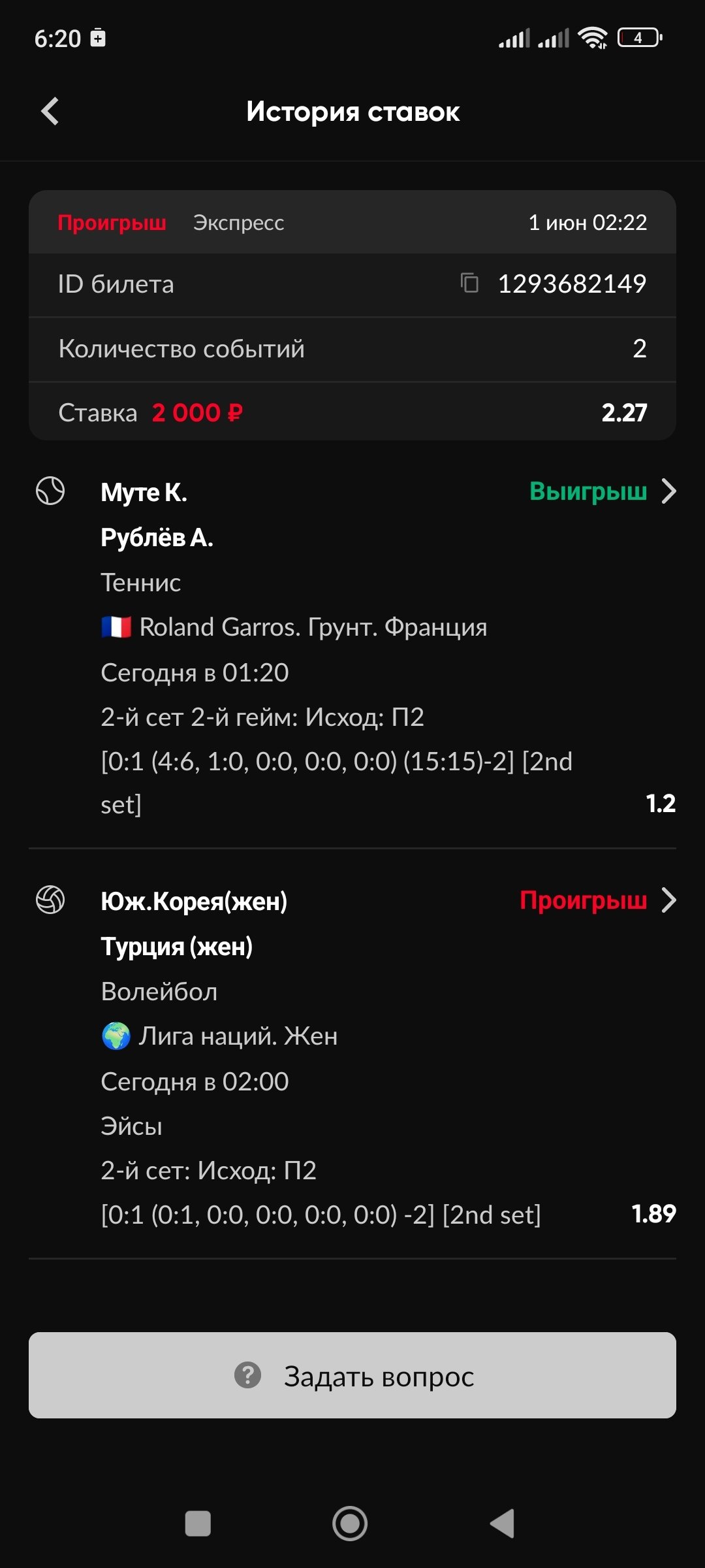 Здравствуйте. В официальном протоколе на сайте международной федерации результат по эйсам во втором сете 1:1. Почему вы решили, что ваша ставка выиграла?