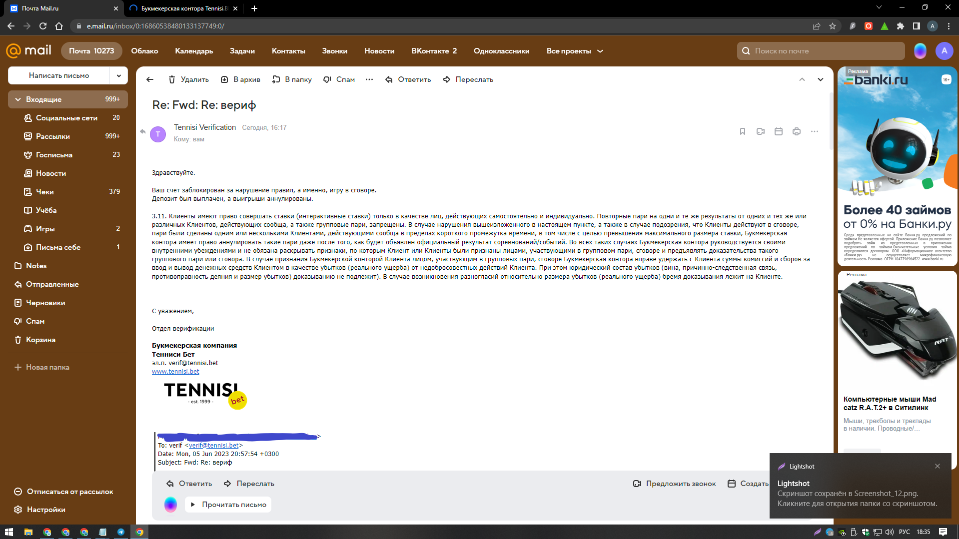 Зарегистрировался в бк тенниси перед чемпионатом мира по футболу , залил тысяч 10-15 рублей и перестал играть на ставках. Недавно вспомнил что есть созданный счет в бк тенниси и начал ставить баскетбол МПБЛ Филиппинский, линию и лайв дают все снг и зарубежные бк . Пополнил на 10к рублей . Поставил 7 ставок на которые все вроде бы зашли , ставил победы форы туда сюда. Выплатили 12 тысяч матч еще был в игре одни , после ставлю еще 9 на вывод -запрос документов . Отправил видео все документы мурыжили 2 недели и сегодня отправили такое сообщение на почту . Все скрины счета прилагаю. Непонимаю даже о чем они. Я непонимаю куда обратиться и что делать с недобросовестными букмекерами которые пытаются отжать честно выйгранные денежные средства. МИРОВАЯ линия баскетбола и просто какие то ставки в сговоре) смех да и только
