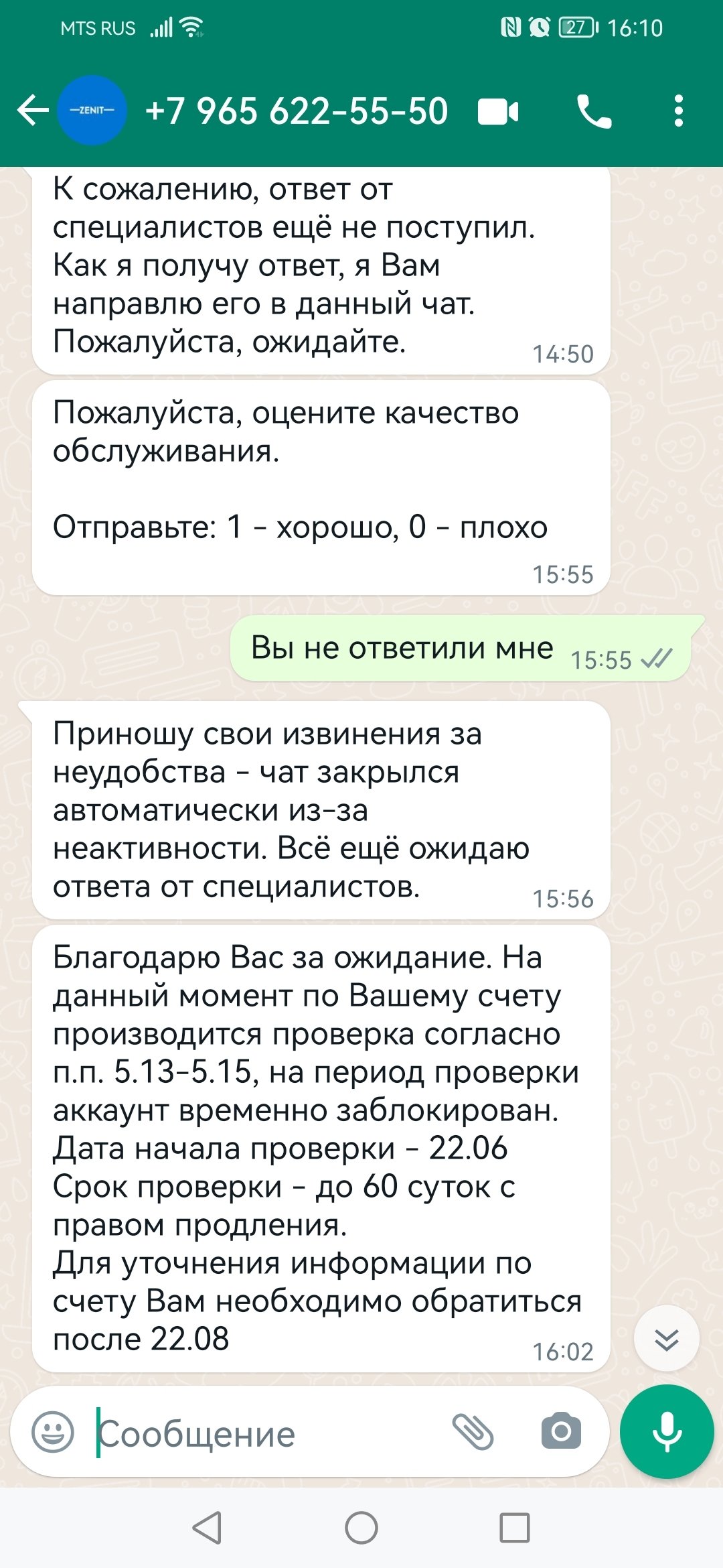 Добрый день! Помогите пожалуйста решить проблему с бк зенит. 19 мая я начал играть в данной бк. Все было нормально. В основном проигрывал и не замечал ничего плохого. Выплаты были быстрые. Затем 09 июня получил зарплату и начал ставить суммы большею И оказался в плюсе. На счету 35000р. После запроса на выплату потребовалась верификация. Отправил паспорт, верификацию прошел. Это длилось 3 дня. Затем отправил заявку на вывод. 4 дня не выплачивали. Общался со службой поддержки регулярно. Они уверяли, что выплата придет точно. В итоге выплата отменена и потребовалась новая верификация карты. Отправил. Помогите пожалуйста вернуть свои честно выигранные деньги. Когда проигрываешь, никаких проблем нет. Как только я вышел в плюс начались проблемы. Помогите пожалуйста решить данную проблему. Ни единого правила я не нарушал. У меня есть множество фото своего аккаунта, истории ставок, истории счета, переписок со службой поддержки. На электронную почту я высылаю Вам архив со всеми фото как дополнение.
