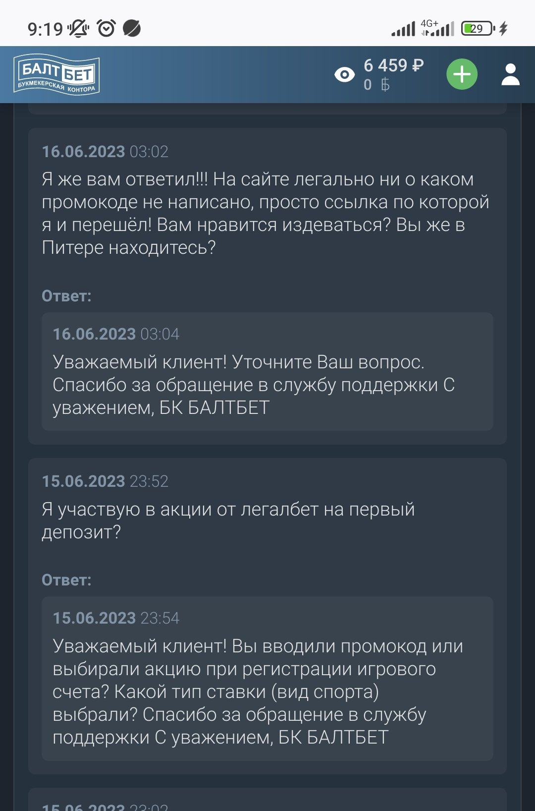 Здравствуйте, перешёл по ссылке и внёс депозит 15000 и спросил у поддержки учавствую ли я в акции бонус на первый депозит, но букмекер делает вид что не понимает, складывается впечатление, что букмекер ждёт когда я проиграю денег и потом скажут, что не ввёл какой-то промокод или ещё что-нибудь, только чтобы не давать бонус. Также обратил внимание, что максимальная ставка теперь не более 5 тысяч. Прошу Вас узнать у букмекера почему не могут просто ответить на простой вопрос, участвую я в акции или нет.