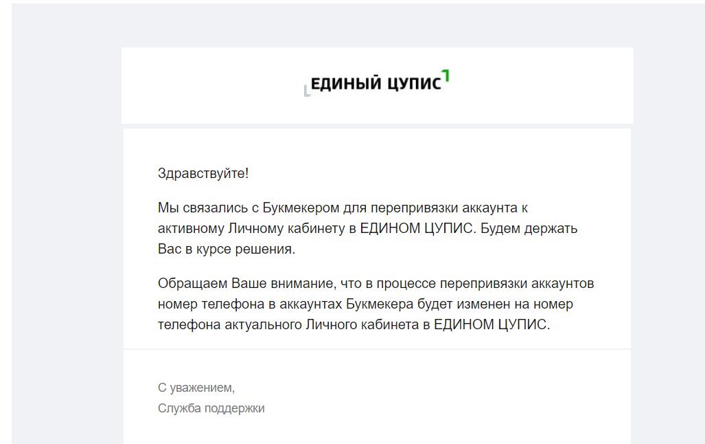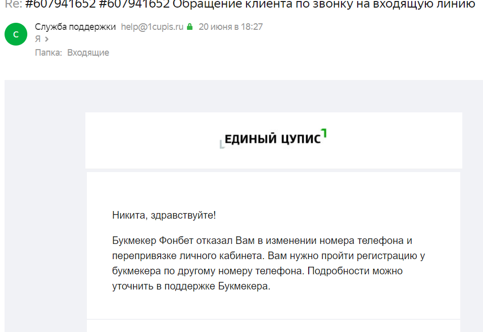 Здравствуйте , 3мая пришла мне верификация от фонбета , которую я не могу пройти, т.к я изначально зарегистрировался под неправильными данными , на что фонбет поддержка оперативно отвечала до 3х часов и посоветовала обратиться в единый цупис, поменять неправильные данные на верные и после чего пройти уже верификацию с верными данными повторно. Так я и сделал, обратился в цупис, прошел все верификации и после чего осталось пройти только верификации на фонбете, они запросили ряд документов, которые я оперативно скинул и тут начался АД, они стали отвечать на каждое мое сообщение через 4-6 дней и пишут одно и тоже, они теперь просят документы от человека которого не существует, они психи , на любые мои сообщения ответ один. Ожидаем документов Олега. Я просто в шоке. Прикладываю так-же ответы от единого цуписа, что проблема со стороны букмекера! который требует верификации от человека, которого не существует