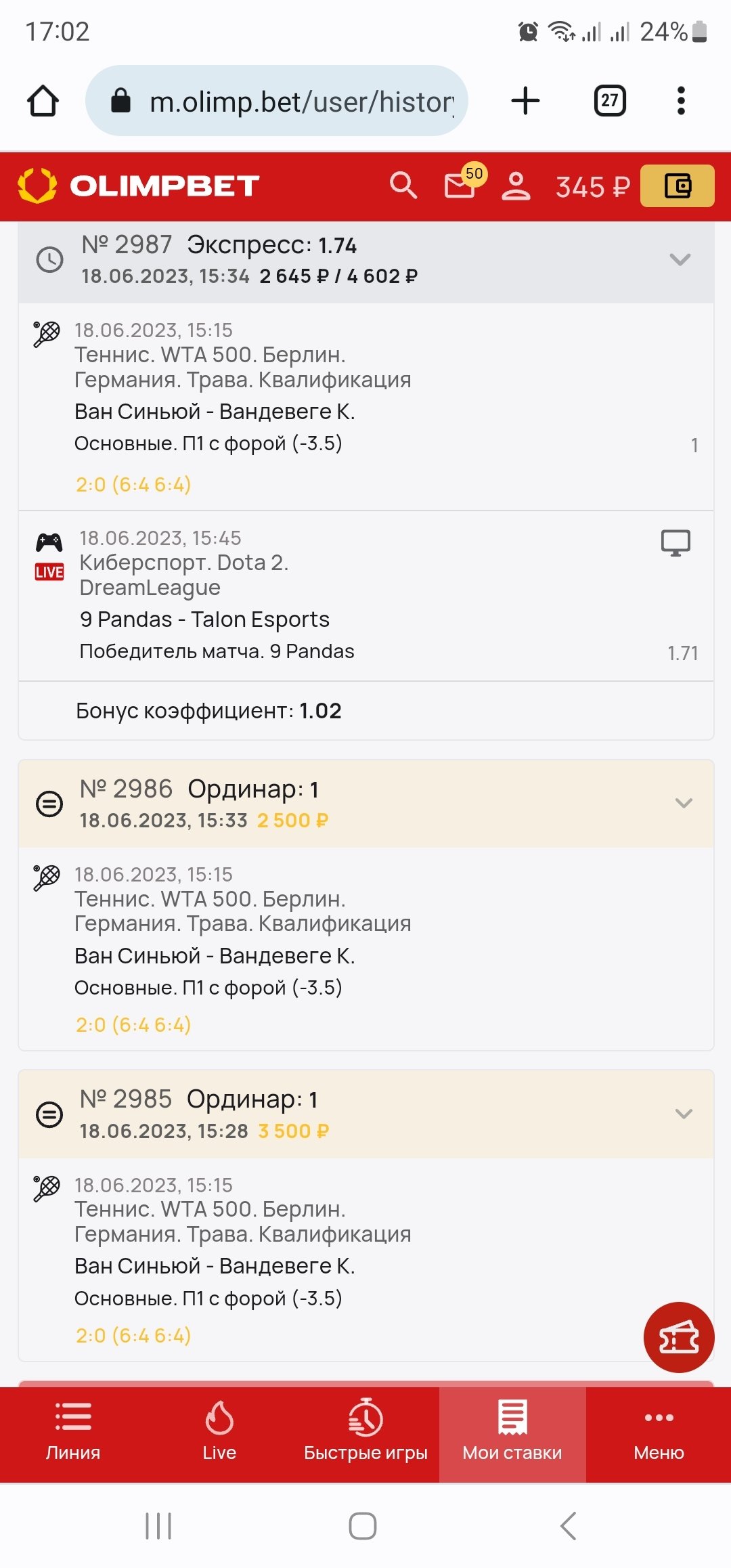 Делаю 5 ставкок в лайве, в разное время, на одно и тоже событие. Теннис. WTA 500. Берлин. Германия. Трава. КвалификацияВан Синьюй - Вандевеге К. Основные. П1 с форой (-3.5) 1 ставка сделаны на счет 2:0, 1 на победу 1. И еще 3 на фору -3.5 (все 3 в разное время в диапазоне 30 минут). Матч заканчиваеься со счетом 6-4, 6-4. Ставки на победу и 2-0 рассяитываются как выиграшные, а ставки на фору оформляются как возврат. Коэффициенты все были обычные, низкие, до 1.9, никакой ошибки по завышению 100% не было. Тех поддержка отвечает, извините, но в коэфах была ошибка, поэтому возврат. Какая была ошибка - не отвечают. Предложил рассчитатб мою ставку по заниженному кэфу (раз они говоря что он был неверный) - отказ, считают справедливым кэф 1. Удивительнл, что ошибка по всем трем события в разное время! Хотя на победу и 2-0 ошибки нет.