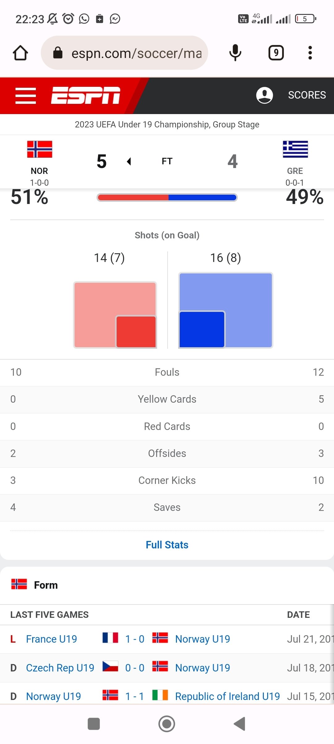 По Норвегии Греции повтор трансляции найти не могу,нашел вот только общее количество на еспн ком,там у Норвегии 10 фолов за матч,то есть если вычесть 5 фолов во втором тайме то получится что в первом тайме у них УЕФА не учел 3 фола,в первом тайме у них было 5 фолов,у Греции все вечно уефа берет 7 фолов,итого первый тайм 5-7