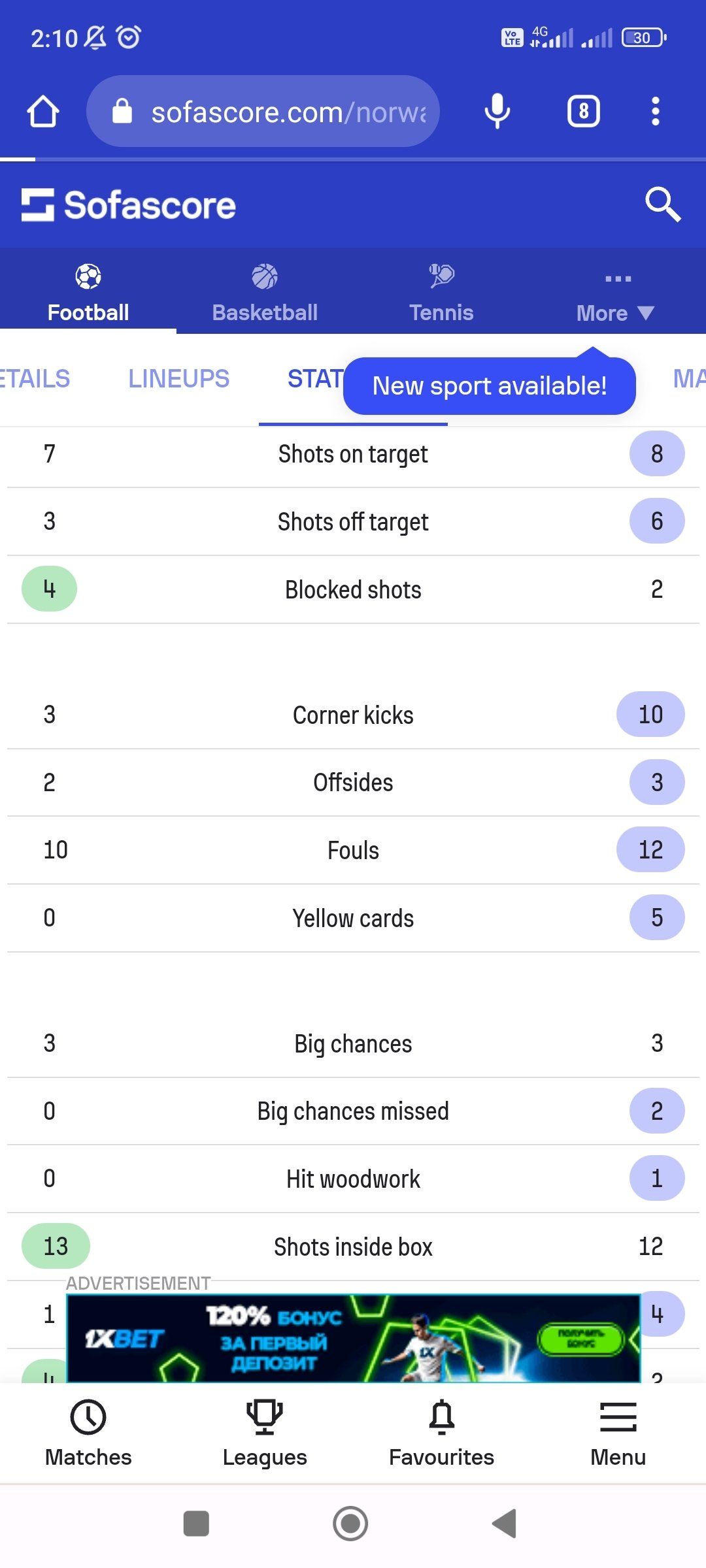 Этот матч я в перерыве ещё и не скринил количество фолов,так как думал будет официальный протокол,но в перерыве флашскоре вообще давал 7-7 по фолам,а потом откорректировал под данные УЕФА,но этот матч прям аналогично Исландии Испании не досчитано 3 фола норвежцев, только как это доказать без видео трансляции я не знаю