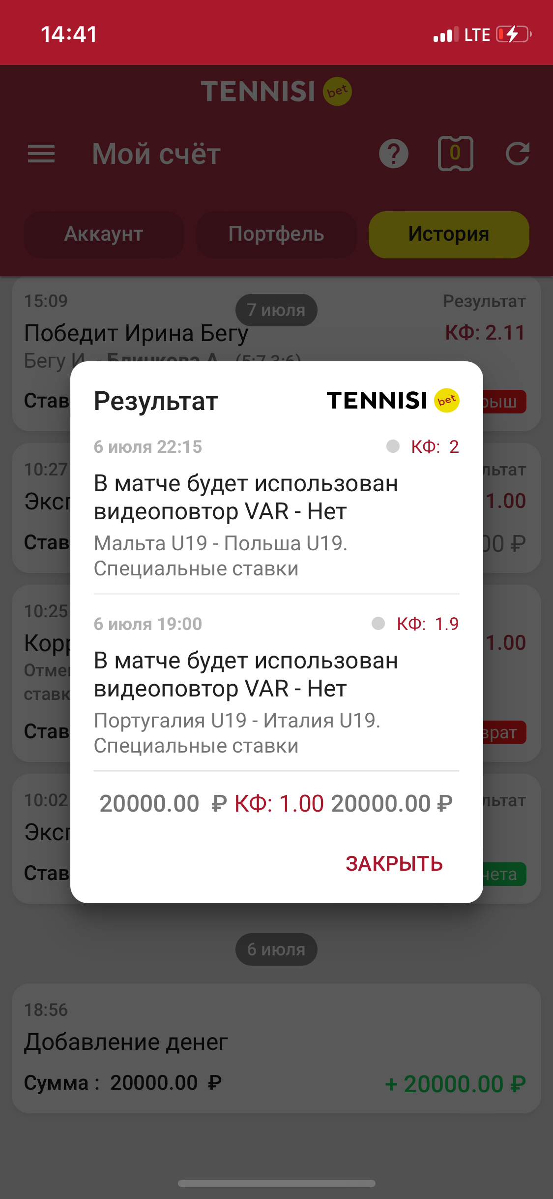 Здравствуйте, Уважаемая Администрация ЛегалБет, большая просьба посодействовать и не дать сойти с рук такому откровенному грабежу клиента и трактовки правил исключительно в пользу своей выгоды со стороны данного букмекера. Пари #1208064501 Заключил пари экспресс из 2-ух событий: Португалия U19 - Италия U19 Мальта U19 - Польша U19 Специальные ставки Пари на то что «В матче будет использован видеоповтор VAR - Нет» Просмотрев внимательно оба матча в прямом эфире внимательно вглядываясь в каждый спорный эпизод , дабы букмекер не решил «побрить» меня как в предыдущий раз , за невозможностью предъявить доказательства с моей стороны (я получил проигрыш по выигранной ставке). Хочу отметить что данный букмекер трактует правила исключительно в свою пользу, малейшую возможность не выплатить деньги букмекер использует на все 100% указывая на свои пункты правил. И так матчи прошли жду расчета своих с трудом выигранных денег проходит продолжительное время, обращаюсь в поддержку мол почему расчет задерживаете, мне сказали что информация по матчам уточняется, на тот момент я на всякий случай пересмотрел оба матча по второму кругу дабы на 100% убедится что никаких проверок в спорных моментах не было, во втором часу ночи мне ответили их специалисты проверяют информацию о VAR по регламенту турнира. Хочу отметить ранее был спорный момент в матче Росарио Сентраль 1:1 Колон Санта Фе() Пари #1206018819 У меня оставался последний матч в экспрессе из 3-х событий в этом матче у меня было пари на то что «В матче будет использован видеоповтор VAR - Да» на 8 минуте встречи главный арбитр подбежав к тренерам обеих команд предварительно подозвав капитанов обеих команд проинформировал на португальском, (у меня неплохой португальский на разговорном) что система VAR в данном матче не работает, я сразу обратился в поддержку выразив негодование сказал чтобы сделали возврат по данной ставке так как я уже заведомо проиграл, на что получил ответ, внимание: «У нас нет возврата по ставке VAR, ставка либо выигрывает, либо нет»(Сумма спора этого пари 19 720 рублей) Вы понимаете да?) И так вопрос почему при любых раскладах проигрываю Я ?!?!? Просто малейшая возможность и данный букмекер трактует правила в свою выгоду на 100% Тут просто нереально выиграть. страктовали так правила , сегодня быстренько переобулись сделали как сегодня выгодно, это полная дичь и зашквар….. От испытанного стресса и нервного беспокойства был вынужден вызвать скорую чтобы сделали укол чтобы заснуть. Нигде в правилах не прописано что если регламентом турнира не предусмотрен VAR, контора произведет возврат по событию. Это слова букмекера: У нас нет возврата по ставке VAR, ставка либо выигрывает либо нет. Понимаете да? О возврате тут речи не идет, т.е третьего не дано. Рассчитали мой экспресс ссылаясь на правила п. Что пари не состоялось. Хотя событие завершилось , было сыграно 90 минут. Хочу отметить что являюсь старым клиентом БК Тенниси, такого беспредела раньше, как щас не было, возможно поменялись руководители компании и сотрудникам просто была дана установка «брить клиента при первой возможности» У данного букмекера невозможно провести хороший вечер и насладиться азартом! Хотите споров/трактовок в их пользу долгих расчетов и некорректных расчетов пари ? Если вы хотите именно этих эмоций Вам обязательно нужно заглянуть в >