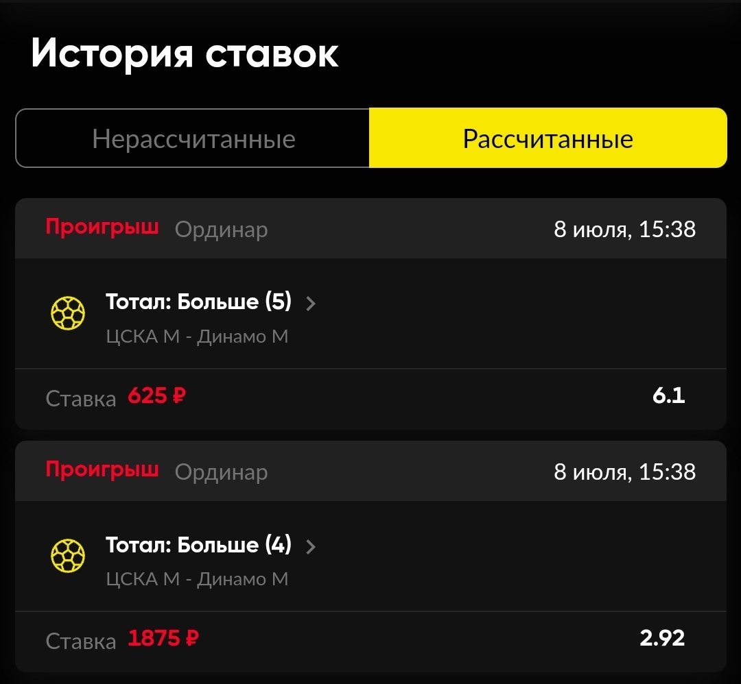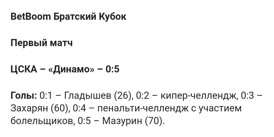 состоялся матча ЦСКА - Динамо в рамках Братского кубка BetBoom. Во всех медиа источниках счет матча: 0-5 в пользу Динамо. Перед матчем, который повторюсь, был организован при непосредственном участии Betboom, было заявлено, что правила матча следующие: Матчи Братского кубка проходят в нестандартном формате: три тайма по 30 минут с двумя перерывами, во время которых проводятся разнообразные челленджи. Победа в каждом челлендже приносит дополнительный гол команде в счет матча. 2 гола были приписаны Динамо по итогам победы в челленджах, которые были заявлены до матча. BetBoom решили рассчитать матч по счету 3:0, нарушая установленный СОБОЙ же регламент матча.