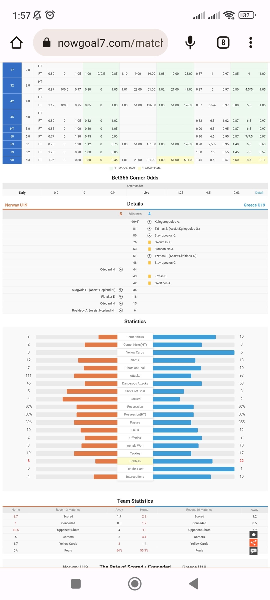 4 июля в матче Норвегия 19 Греция 19 количество фолов Норвегии 5, УЕФА даёт 2 фола,что неверно,контора опирается на данные УЕФА, официального протокола нет ,фолы греции 7 верно даёт,в перерыве не скринил фолы думал будет официальный протокол, но его не было, есть ряд авторитетных источников которые дают в общем за матч 10 фолов Норвегии,и если УЕФА даёт ао втором тайме у них 5 фолов , соответственно и в первом было пять, видео трансляцию найти не могу