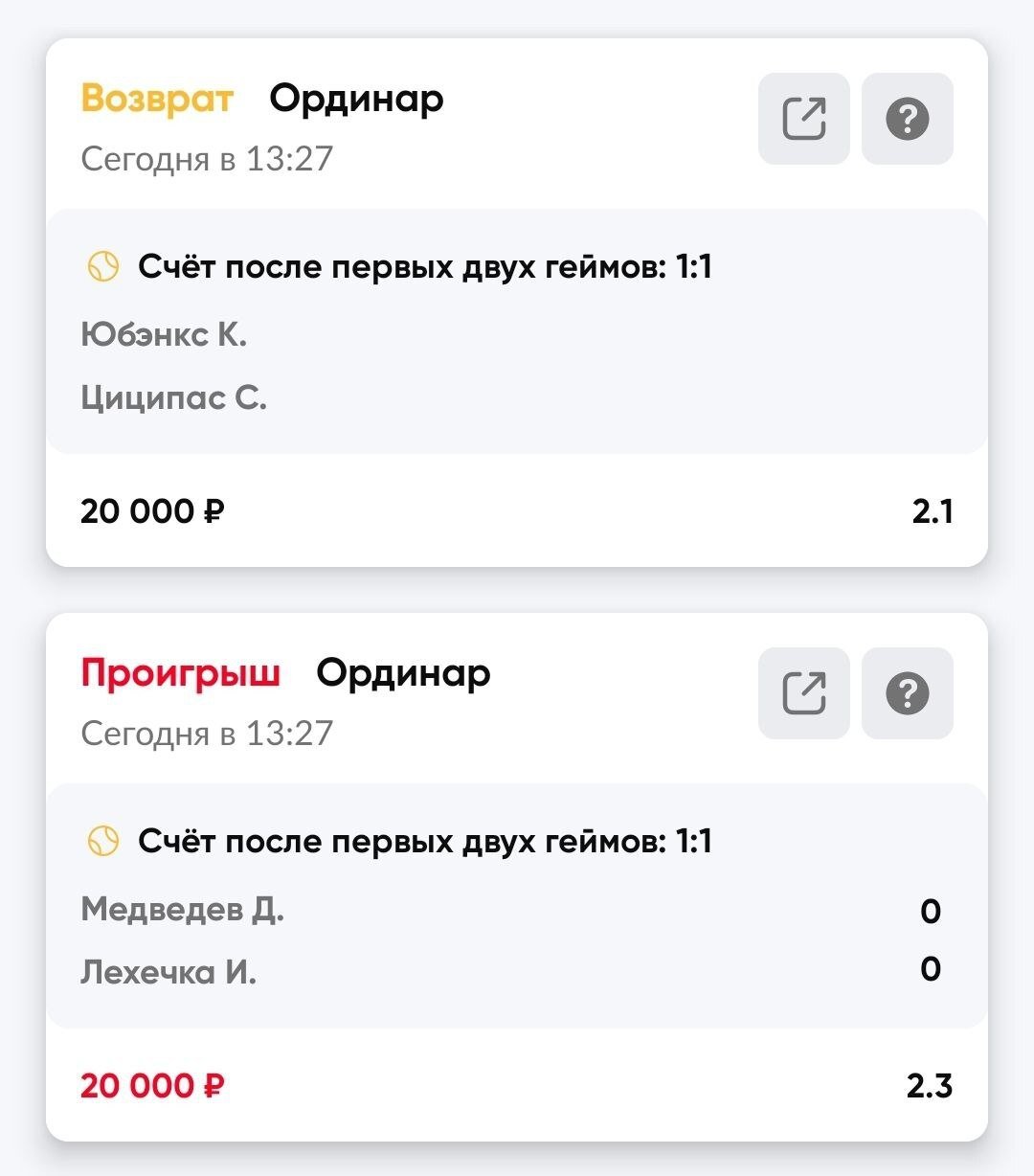 Увидел у данного букмекера два очень валуйных исхода в матчах Циципас С. - Юбэнкс К. и Медведев Д. - Лехечка И. Исход был такой, что счёт после первых двух геймов будет 1:1. Один матч прошёл, другой нет. Тот матч, что прошёл - они рассчитали возвратом, сославшись на то, что была тех. ошибка и коэффициент не соотв. действительности. Матч, исход которого не зашёл - они посчитали проигрышем. По моему мнению букмекер ведёт себя крайне некорректно и нечестно. Либо нужно рассчитывать возвратом эти обе ставки - тем самым вы признаёте, что действительно коэффициенты были выставлены неправильно. Либо просто рассчитываете их по результату ничего не выдумывая. Остался крайне разочарован поведением данного букмекера после сложившейся ситуации.