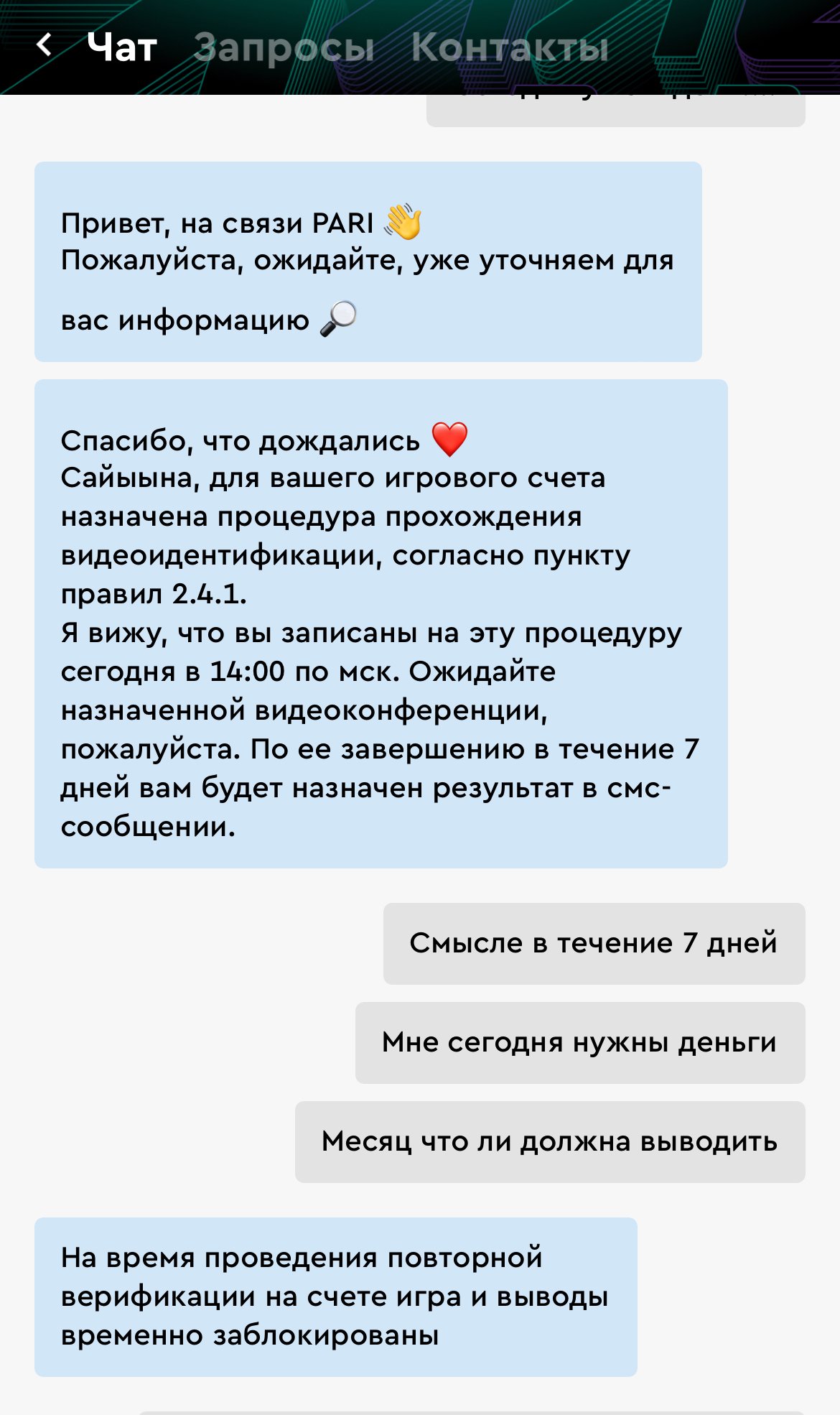 Здравствуйте, я 12 числа с 4 ка подняла 10100. Мой аккаунт взяли на проверку, сначала прошла видеоверификацию потом документы попросили в запросе. Все сделала отправила 13 числа. В чате мне сккзали не позднее 20 числа все будет. Сегодня 19 число, я не могу забрать выплату. Аккаунт 79969145991, помогите пожалуйста