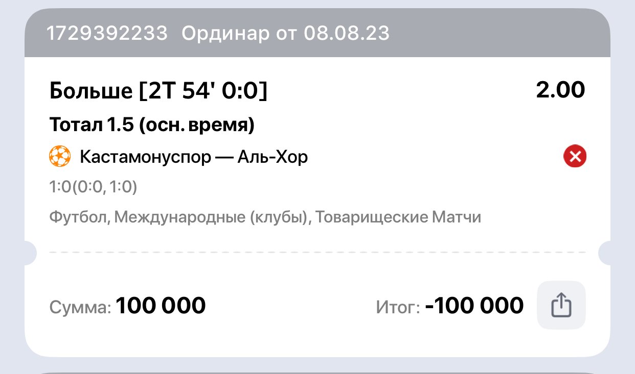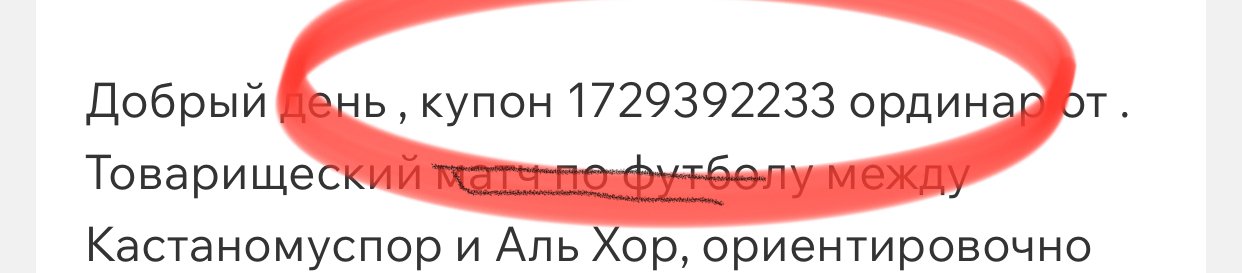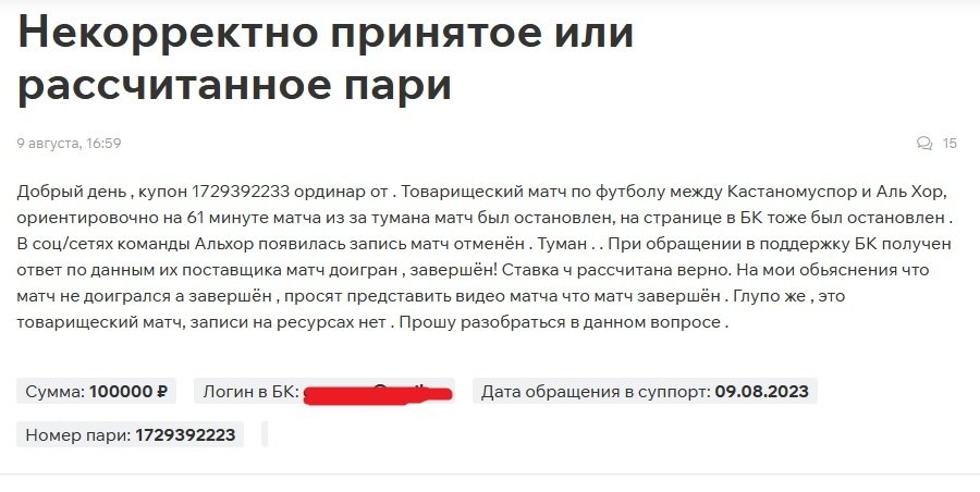 Добрый день , купон 1729392233 ординар от . Товарищеский матч по футболу между Кастаномуспор и Аль Хор, ориентировочно на 61 минуте матча из за тумана матч был остановлен, на странице в БК тоже был остановлен . В соц/сетях команды Альхор появилась запись матч отменён . Туман . . При обращении в поддержку БК получен ответ по данным их поставщика матч доигран , завершён! Ставка ч рассчитана верно. На мои обьяснения что матч не доигрался а завершён , просят представить видео матча что матч завершён . Глупо же , это товарищеский матч, записи на ресурсах нет . Прошу разобраться в данном вопросе .