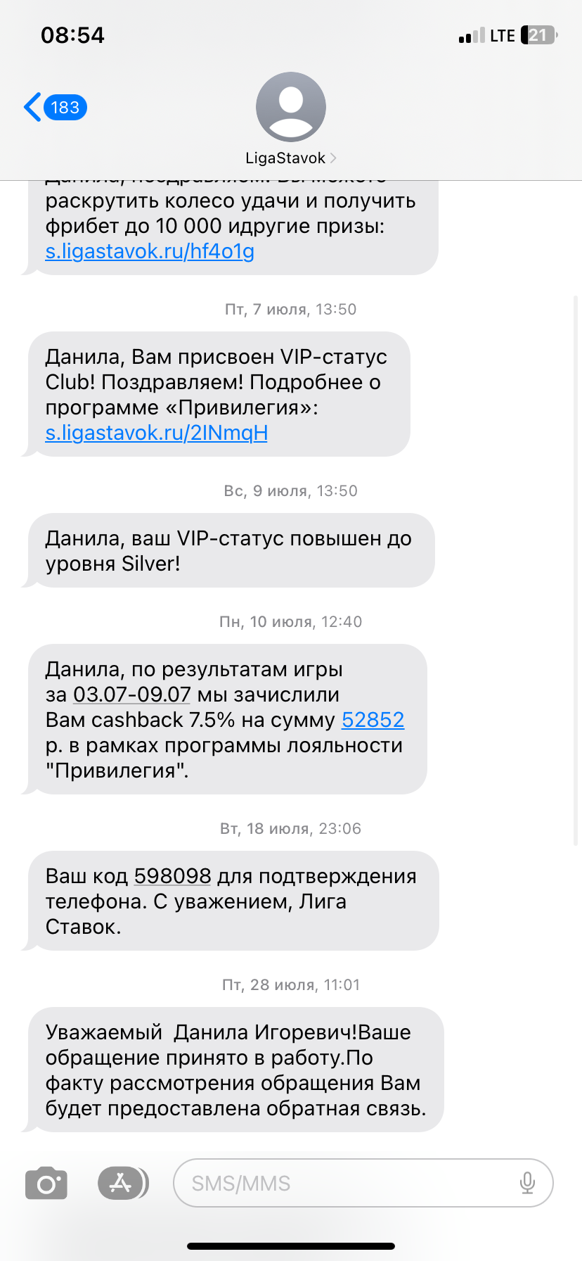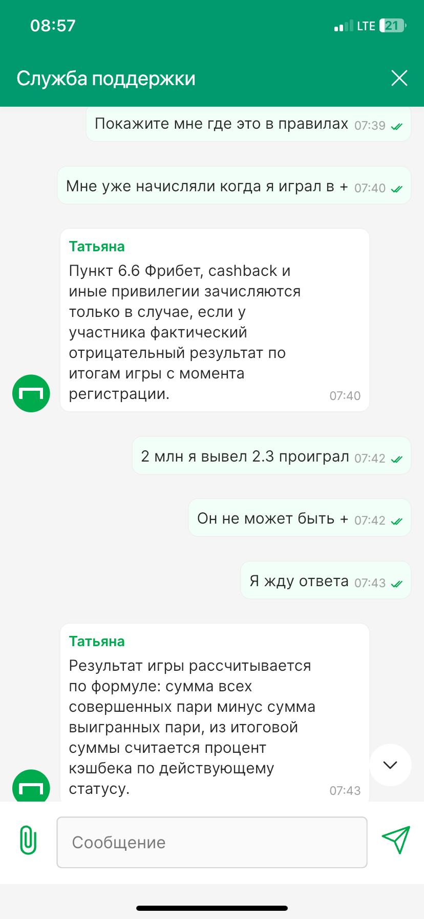 Изначально все было хорошо, с регистрацией проблем никаких, вывод так же был супер быстрым. Но все меняется когда ты начинаешь обыгрывать букмейкера, около месяца назад смог выиграть с 500 тысяч 2 миллиона, до этого выигрывал примерну ту же сумму но за 1 большую ставку (привет алькарасу и джоковичу) в тот раз деньги вывели довольно быстро и вопросов никаких не было. Вывел не всю сумму, оставил на поиграть около 500 тысяч. В итоге за 2 недели получилось 2 млн. Контора заморозила вывод денег. В свой выходной поехал в другой город за 200 км. Что бы пройти идентификацию и написать заявление. все приняли, сказали ждать 30 дней. По итогу в это время можно было делать ставки, чем я и увлекся, и за примерно 2 недели проиграл все, ну на это и был рассчет. Но как только денег на счету не осталось, мне сразу стало доступно пополнение, хотя раньше на замороженном аккаунте так было сделать нельзя. Так же у них для клиентов со статусами предназначен кешбек - 10 процентов от того что проиграл за неделю возвращается. Поддержка говорит что мне не положена выплата так как плюсовой аккаунт, но до этого он так же был плюсовым, но в какой то промежуток времени я проиграл за неделю больше чем выиграл. Кешбек дали, да еще и в сообщении написали об этом. Прошу разобраться и вернуть мне хотя бы кешбек ( около 200 тысяч). Ну и надеюсь я смогу их вывести. Очень надеюсь на вас. К слову с момента посещения ппс и написания заявления прошло 18 дней, никаких новостей от них нет
