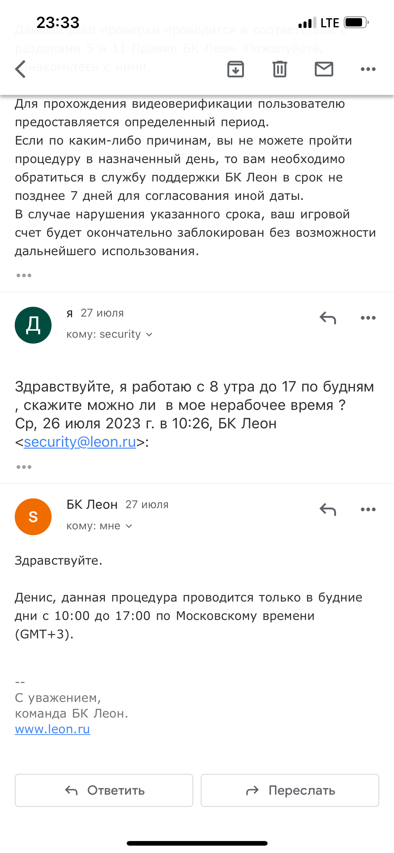 Здравствуйте, служба безопасности букмекерской конторы проводит видеоверификацию только в будние дни с 10 до 17 а я в это время работаю .Я объяснял им что могу освободиться после работы пораньше и пройти с 16 до 17 часов , но они это посчитали отказом от прохождения видеоверификации. Обнулили весь выигрыш . Легалбет просьба помогите