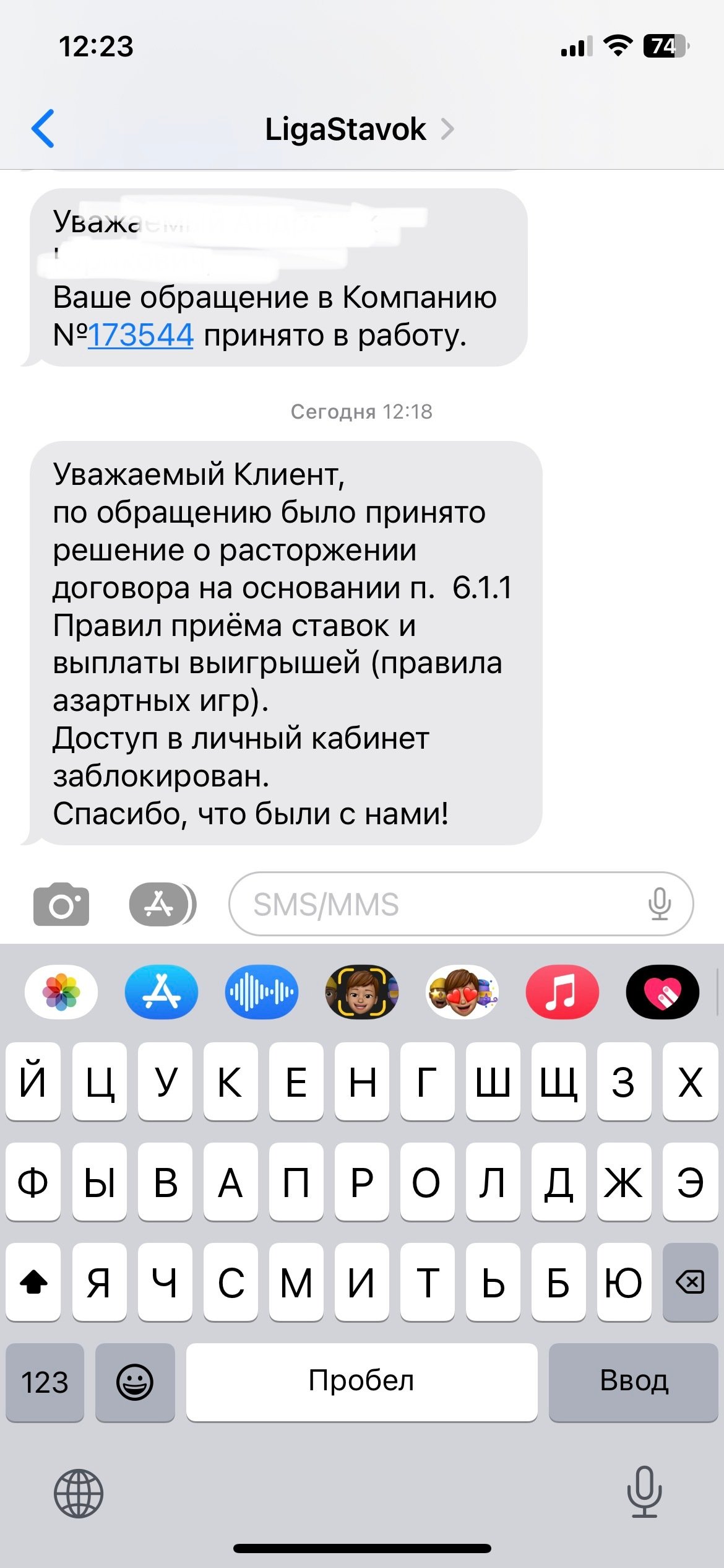 Зарегистрирован в БК Лига Ставок очень давно. 3-4 года назад частенько ставил, больше, конечно, в минус. После этого взял перерыв, не ставил. Неделю назад решил попробовать снова начать ставить, пополнил счет на 20 тысяч, актуализировал паспортные данные и делал ставки. Сумма на аккаунте была 101 тысяча, после чего попробовал вывести 60 тысяч и вышло сообщение об обращении на горячую линию. Доступ к аккаунт сохранялся, даже поставил 2-3 ставки, по итогу сумма на счете была 96 тысяч. Съездил в ППС, написал обращение( номер обращения 173544), прошел полную идентификацию, получил смс о том, что обращение взято в работу. Через полчаса попытался зайти в аккаунт, увидел нулевой баланс, подумал что ошибка, перезашел в аккаунт и увидел сообщение что аккаунт заблокирован.