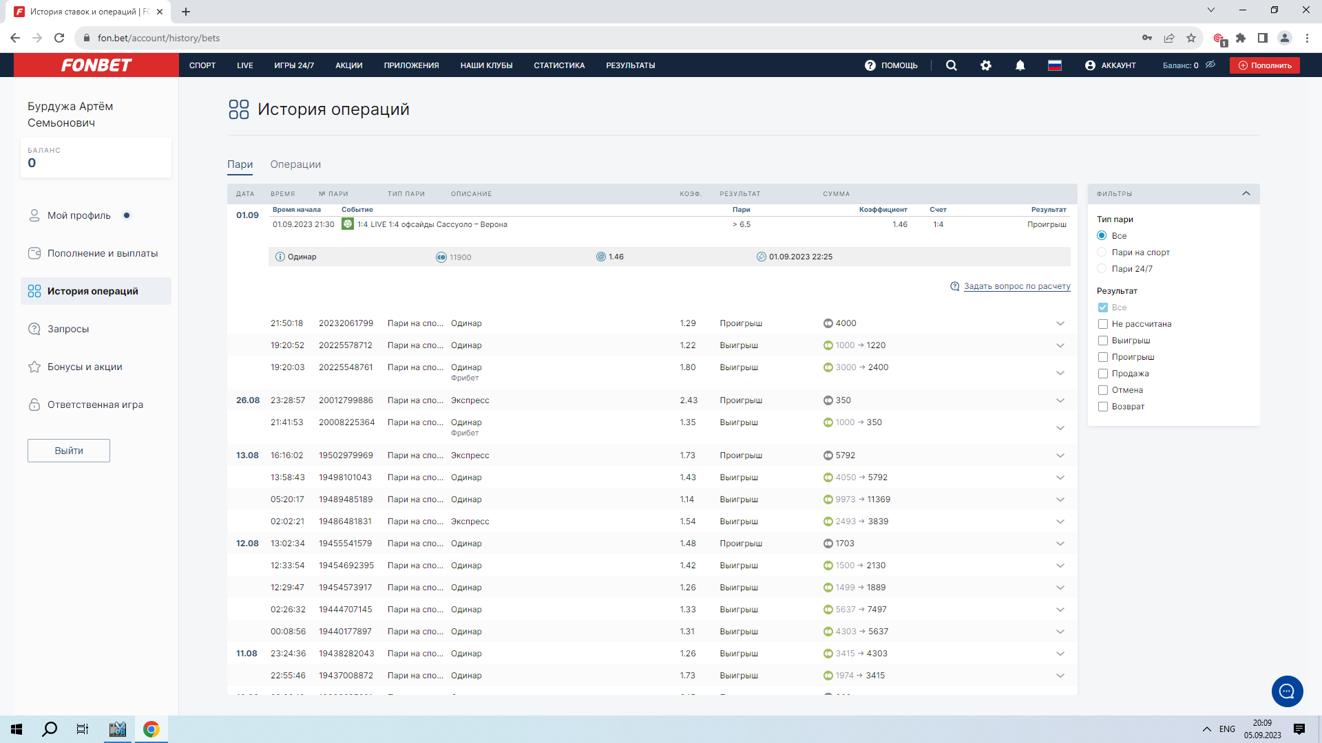 Ставка на то, что во втором тайме матча Сассуоло - Верона будет зафиксировано 2 офсайда. Зная какие проблемы у БК Фон с расчётом статистики, следил за источником информации по которому рассчитывалась статистика по данному матчу. И увидел, что этот источник перестал считать офсайды после первого тайма, от слова совсем. Указываю время момента передачи и последующую фиксацию офсайда арбитром во втором тайме: 61:58, 86:24.