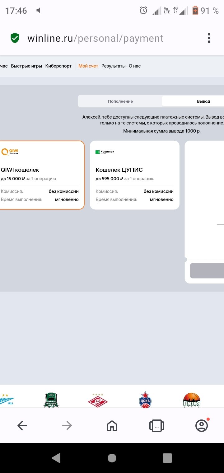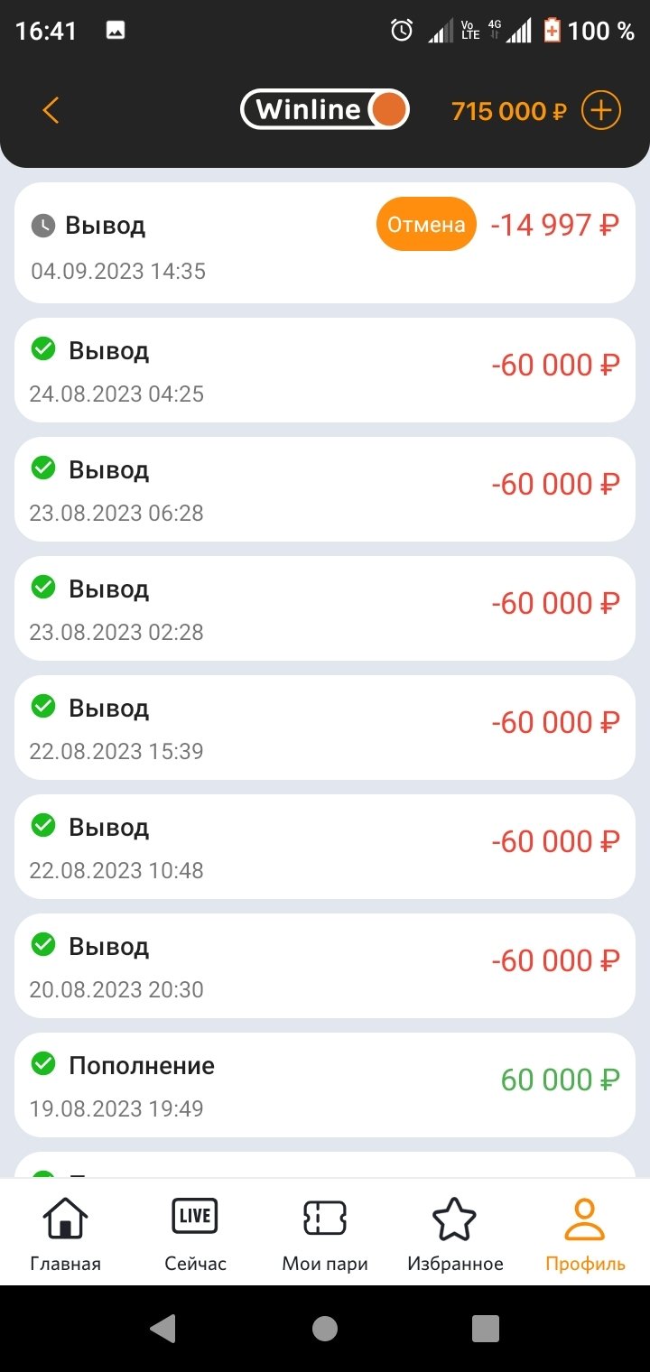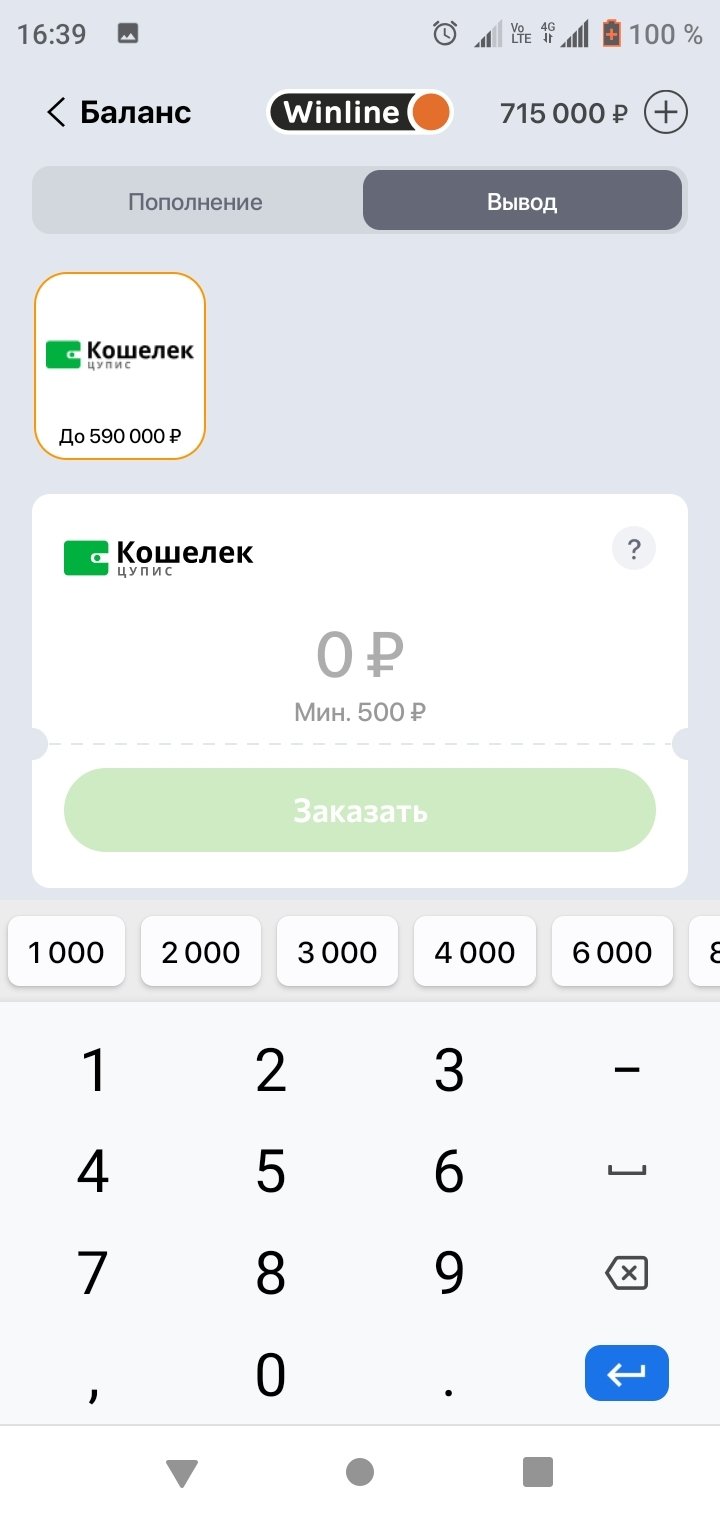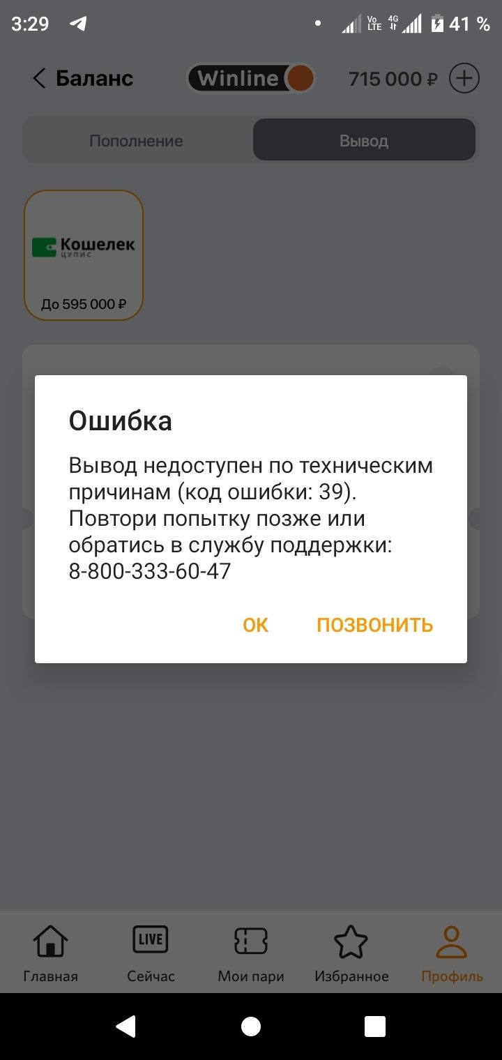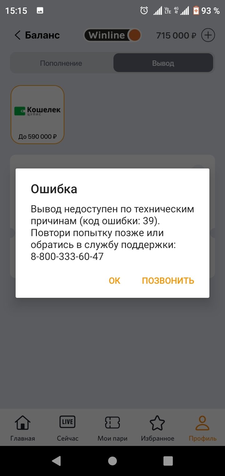Добрый день. Все верефикации которые запрашивала Winline, я их прошел. Сначала давали ввести на карту но потом ограничили вывод только на банковские реквизиты, с 26 августа были заявки в обработке, вчера все они сбросили, сумма не ушла, запрошенные суммы вернулись. На карту вывод не возможен, щас есть только вывод на кошелек цупис с обработкой запроса до 10 рабочих дней. Появилась ошибка 39, сумму для обработки даёт не более 10000р. В колл-центре сказали что техническая ошибка и нет сроков не устранения, что она именно у моего аккаунта и они не знают из за чего это. Удалось отправить на вывод только 10000 р., и опять же все на рассмотрении. При повторе вывода ничего не происходит, как будто глючит приложение.Также нет никаких оснований на запрет и ограничение по выводу.Просьба помочь с выводом денег с аккаунта.