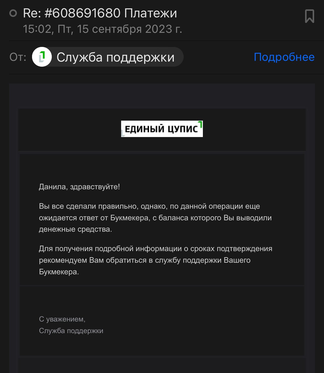 ЦУПИС прислал ответ, что со стороны букмекера задерживается выплата.
