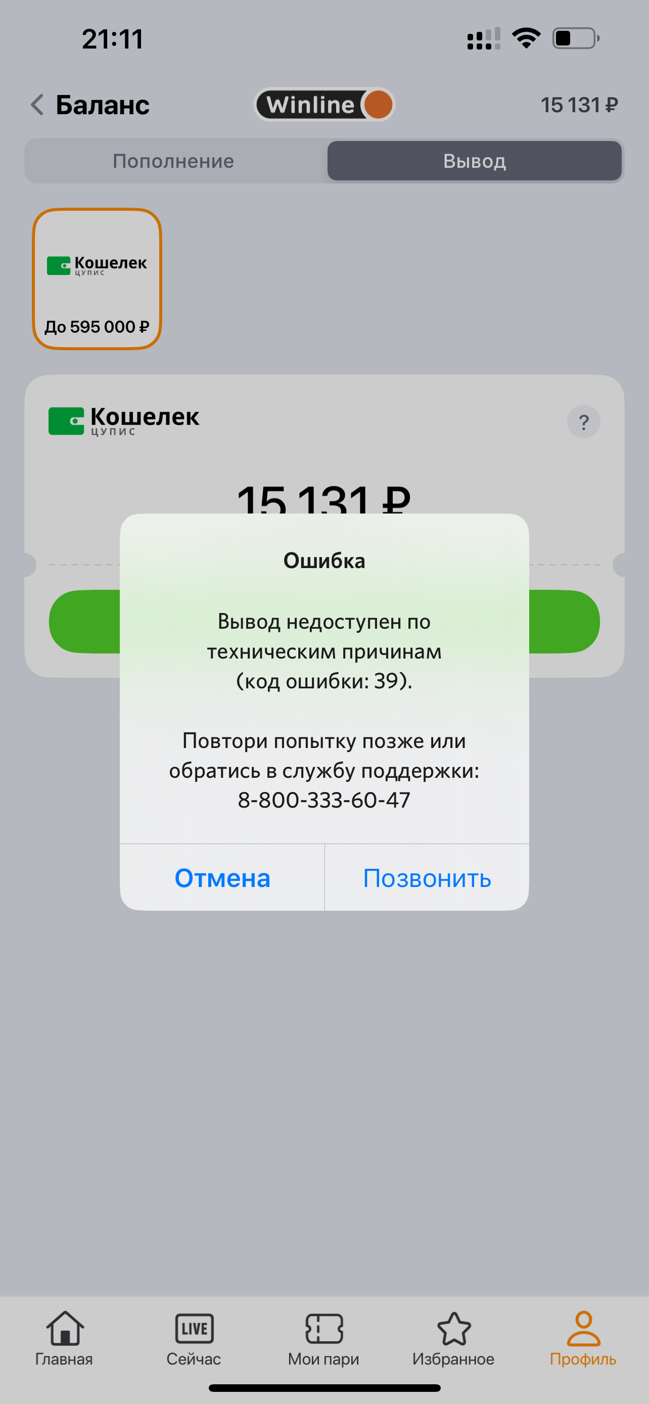 Писал жалобу 26 августа legalbet.ru/complaint/14276461/ Мне ответили, чтобы я повторил жалобу если букмекер будет проводить верификацию больше 10 дней. Прошло две недели с момента, как я отправил букмекеру все нужные документы. В поддержке не отвечают, вывод средств недоступен, на электронной почте так же нету ответа от Winline.Так же при выводе показывает, что средства можно вывести только на кошелек ЦУПИС, но когда создаю заявку на вывод средств проходит около суток и мне приходит на mail ошибка от ЦУПИС, что деньги не дает вывести именно букмекер.