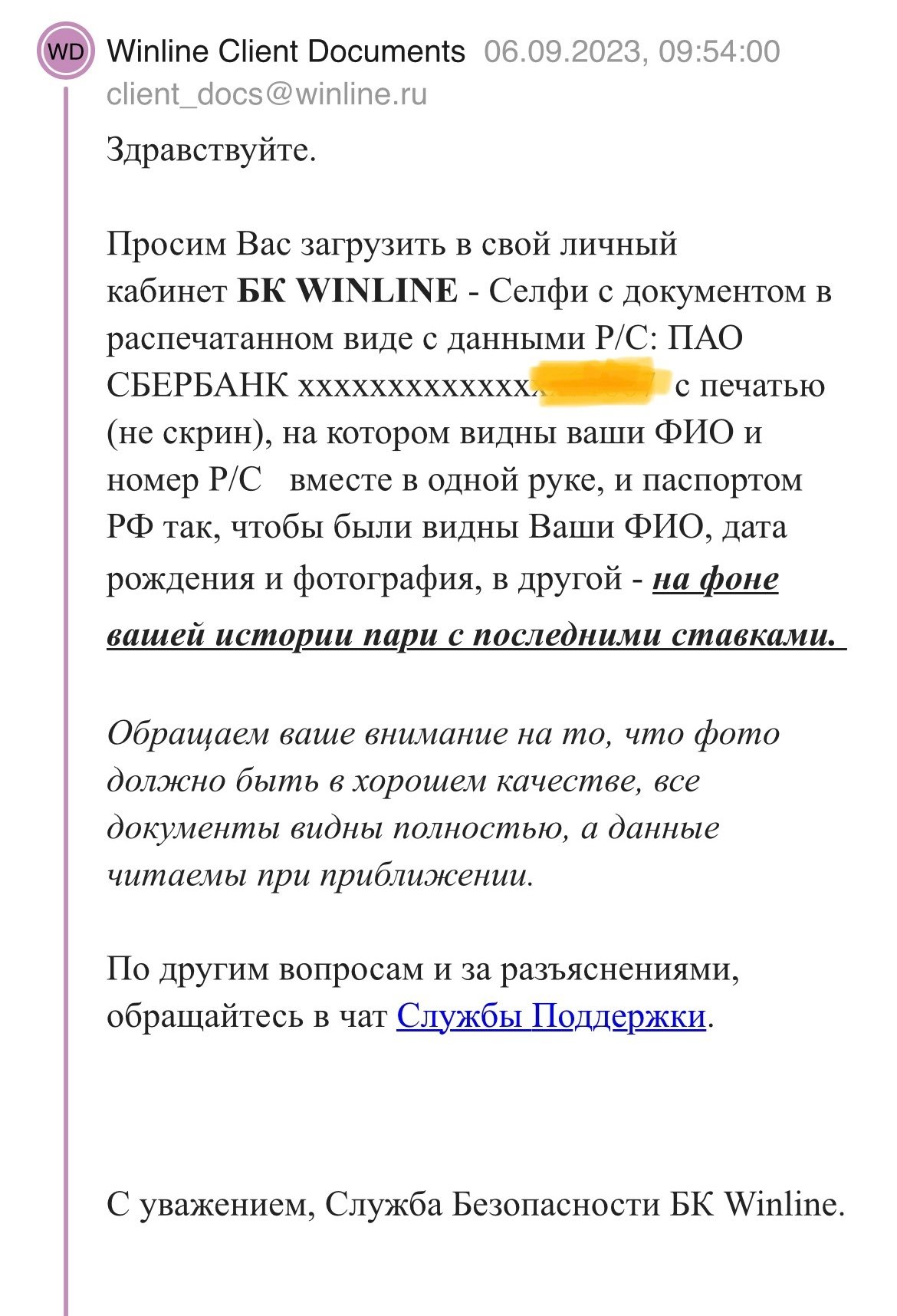 Добрый день. Ставил на теннис, выигрыш/депозиты примерно одинаковые.1. Порезали линию, на ординар с кеф 1.8 мах бет 100р.2. Блокировка аккаунта, запрос документов.3. Копия договора на услуги мобильной связи с номером телефона привязанном в ЛК винлайн.4. Копия детализации расходов по номеру телефона на почту СБ винлайн.5. Копия справки движения денежных средств на карте с которой делал депозит ра почту сб винлайн.6. Фото с реквизитами рс карты с которой делался депозит + паспорт+ скрин страницы ставок из ЛК винлайн.7. Поддержка говорит выводите на ЦУПИС. При выводе стандарт ошибка 39…