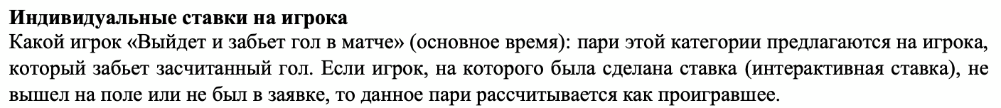 Здравствуйте. В правилах есть отдельное указание относительно таких рынков. Какой игрок «Выйдет и забьет гол в матче» (основное время): пари этой категории предлагаются на игрока, который забьет засчитанный гол. Если игрок, на которого была сделана ставка (интерактивная ставка), не вышел на поле или не был в заявке, то данное пари рассчитывается как проигравшее.