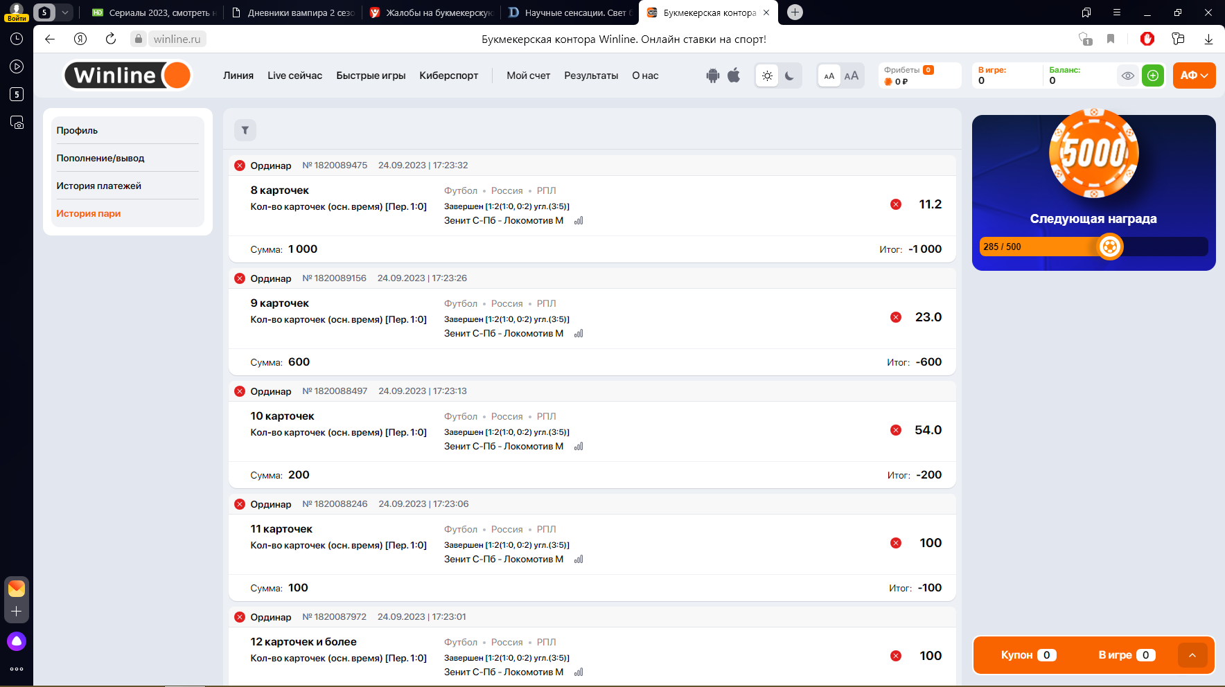 у зенита в винлайне стоит что только 2 желтые карточки а их не две вдругих конторах 4