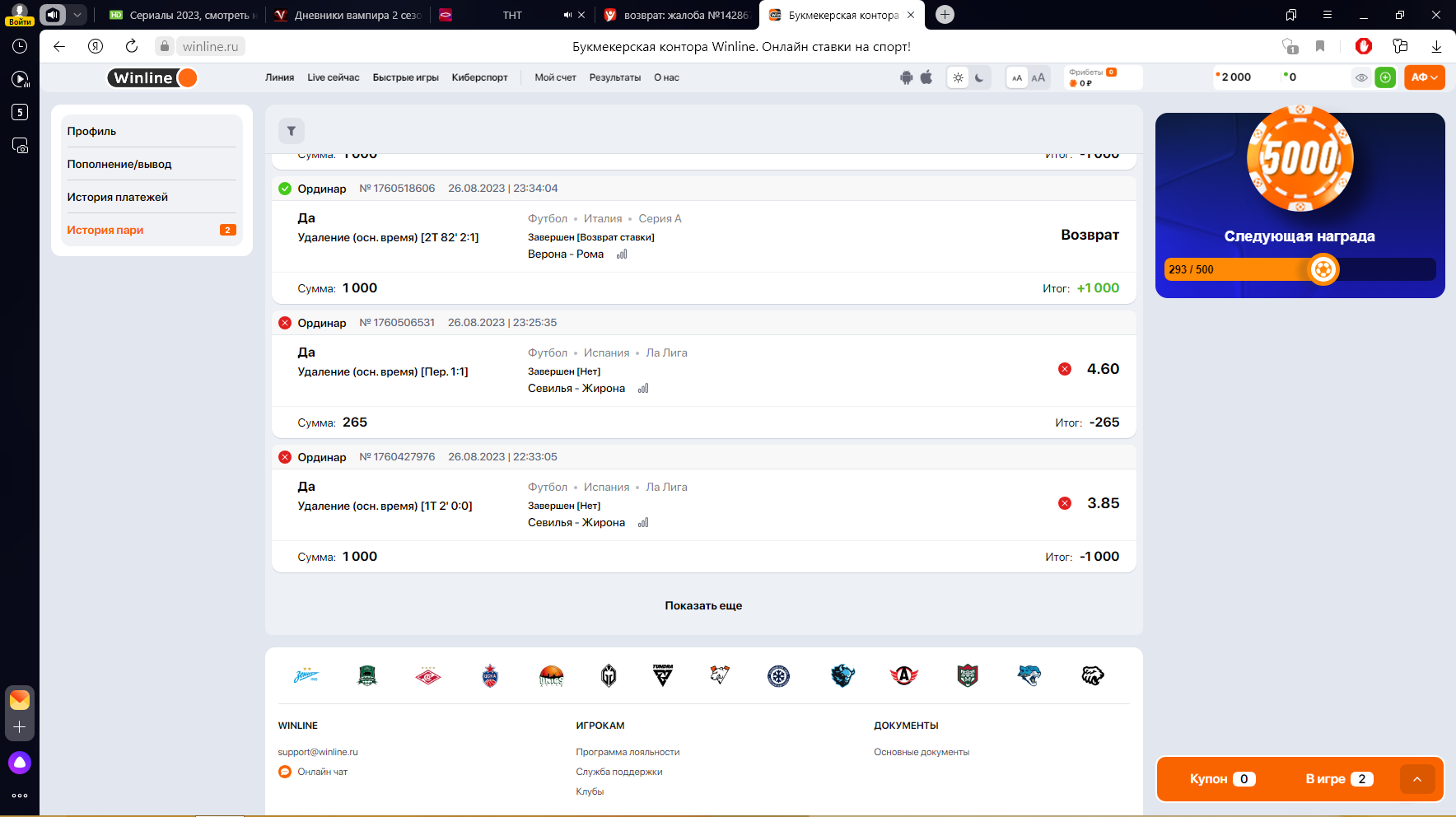 поставил на удаление через три минуты удаление я жду деньги а там возврат Я не пойму что за контора винлайн пари принито ставка с играла и возврат ДаУдаление (осн. время) [2Т 82' 2:1]ФутболИталияСерия AЗавершен [Возврат ставки]Верона - Рома