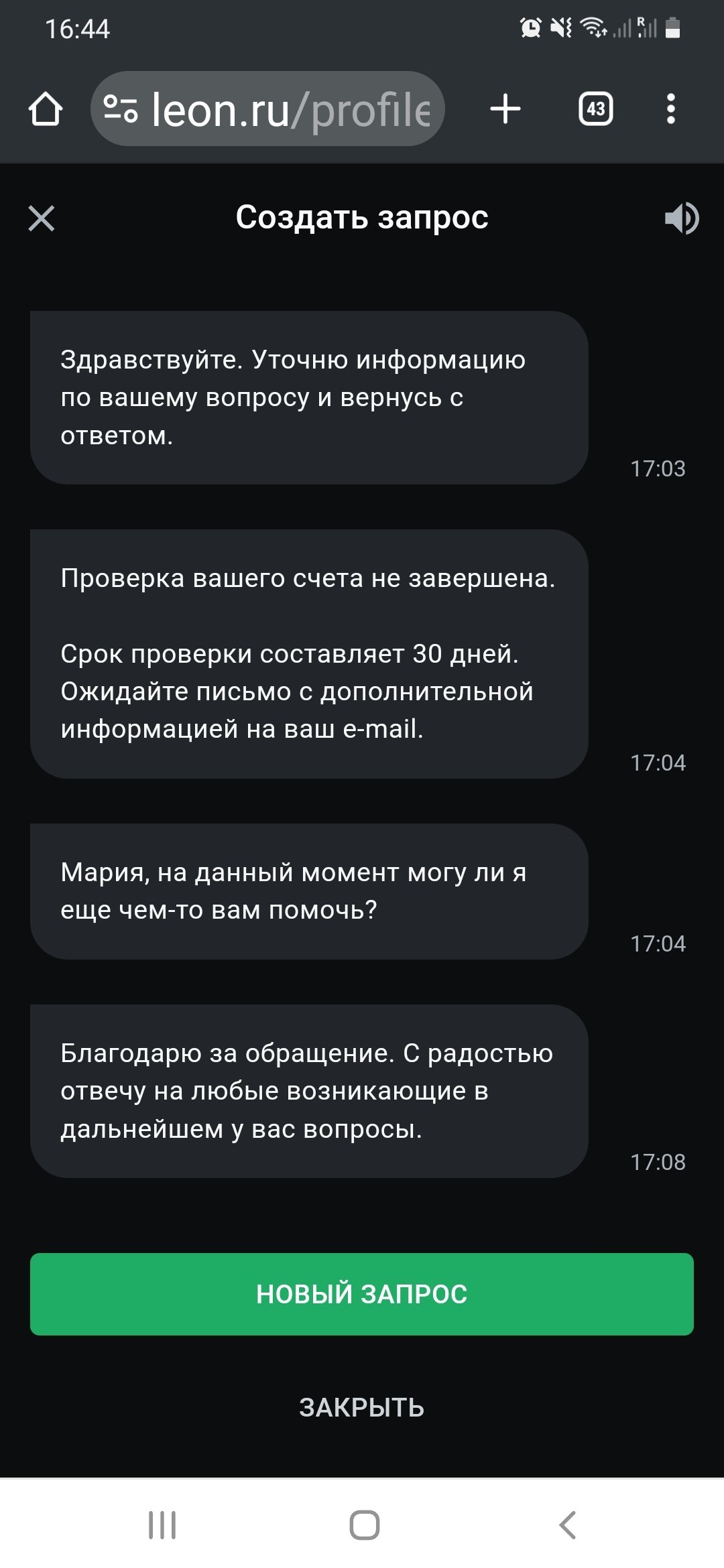 Добрый день! 13 сентября хотела вывести 20430 р и появилась кнопка верификации ,всё что просила предоставила ,паспорт ,банковская выписка по карте ,сказали ждать 30 дней решение ,ответ будет на эмэил ,вчера спрашивала в чате поддержки ,сказали 30 дней не прошло ,ждите ,проверяю и спам и входящие ,ничего ,видеообщение не былоПрошу Вас,помогите в этом вопросе,Благодарю