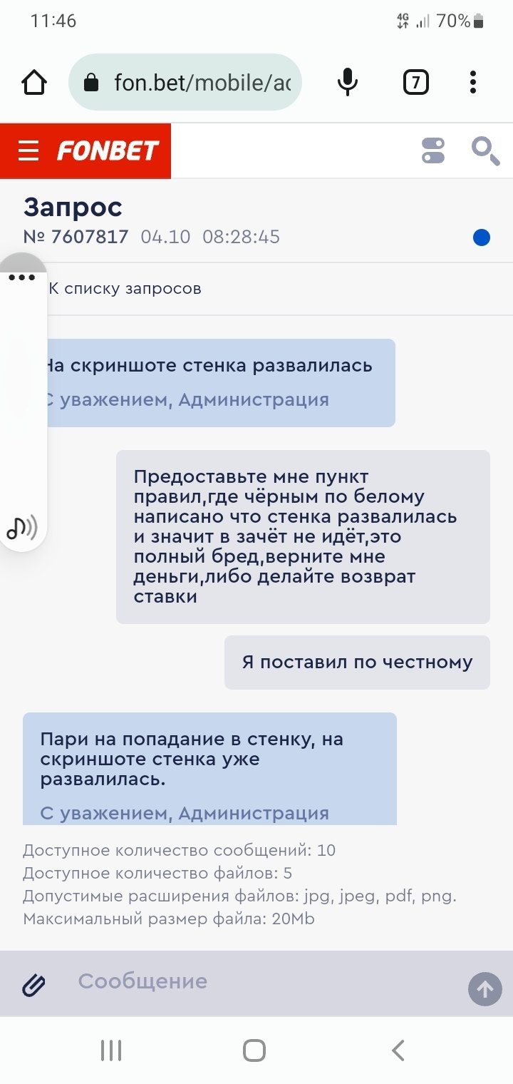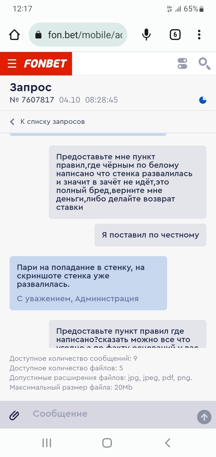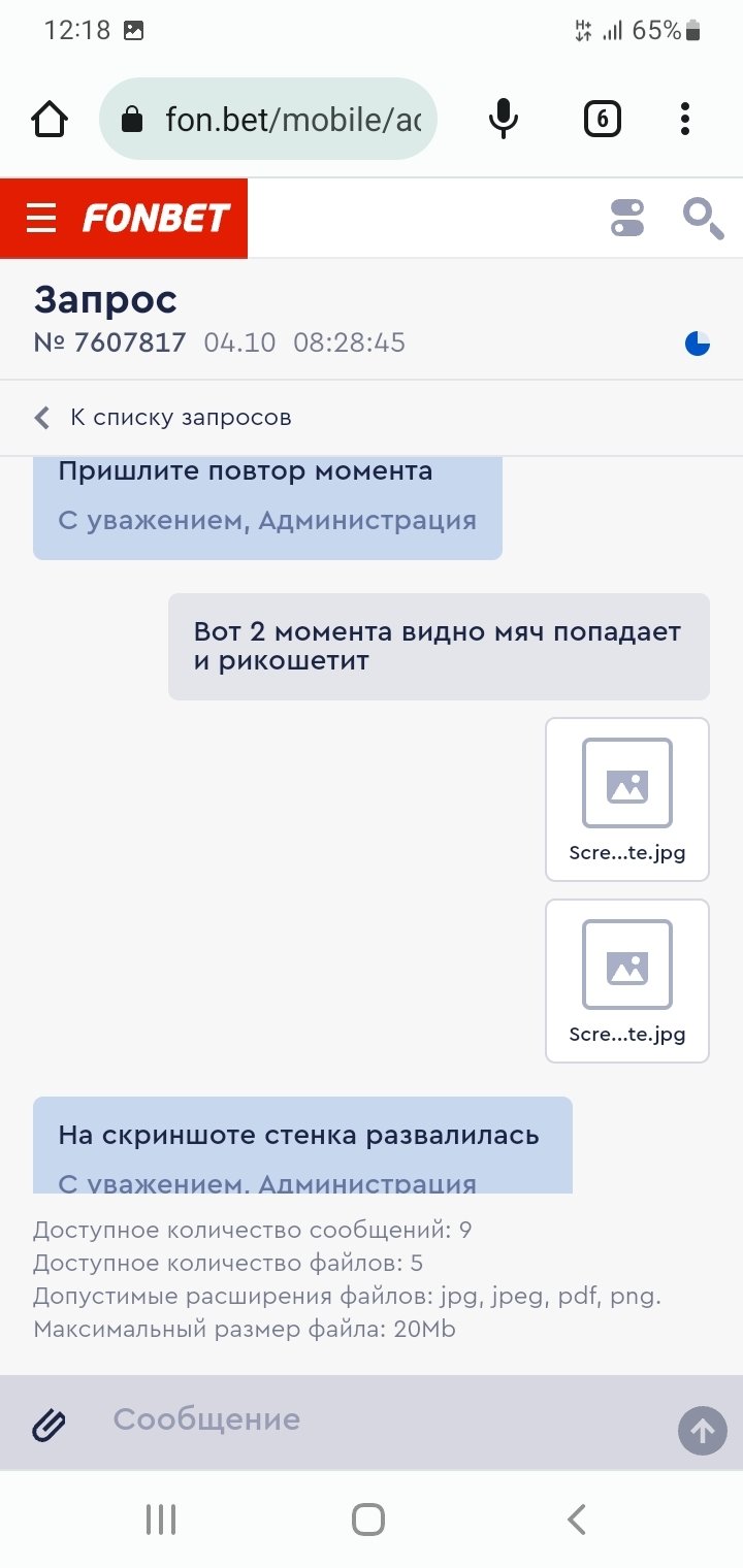 Ставил на футбол матч лиги чемпионов между Наполи-Реал Мадрид раздел специальные ставки,после штрафного удара мяч попадет в стенку-ДА,матч смотрел и видел своими глазами что в первом тайме на 45+1 минуте был штрафной удар,после которого мяч задел игрока из стенки,это зафиксирована как на видио так же фотографиями и всеми текстовыми трансляциями,букмекер фонбет рассчитал проигрышем,написал им в поддержку предоставил фотографии,изначально они ответили что мяч не попал в стенку а потом и вовсе сказали что стенка развалилась и тут я вообще не понял не чего и понял что от них правды не добиться,будьте добры помогите разобраться в проблеме.